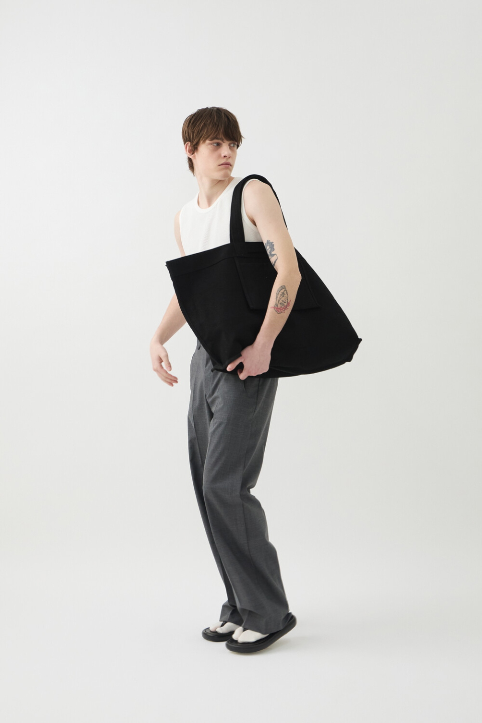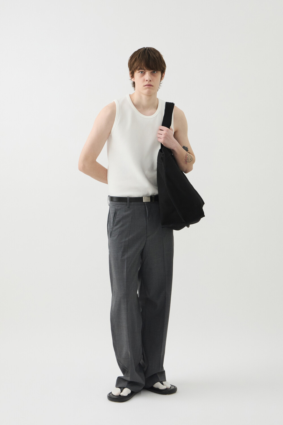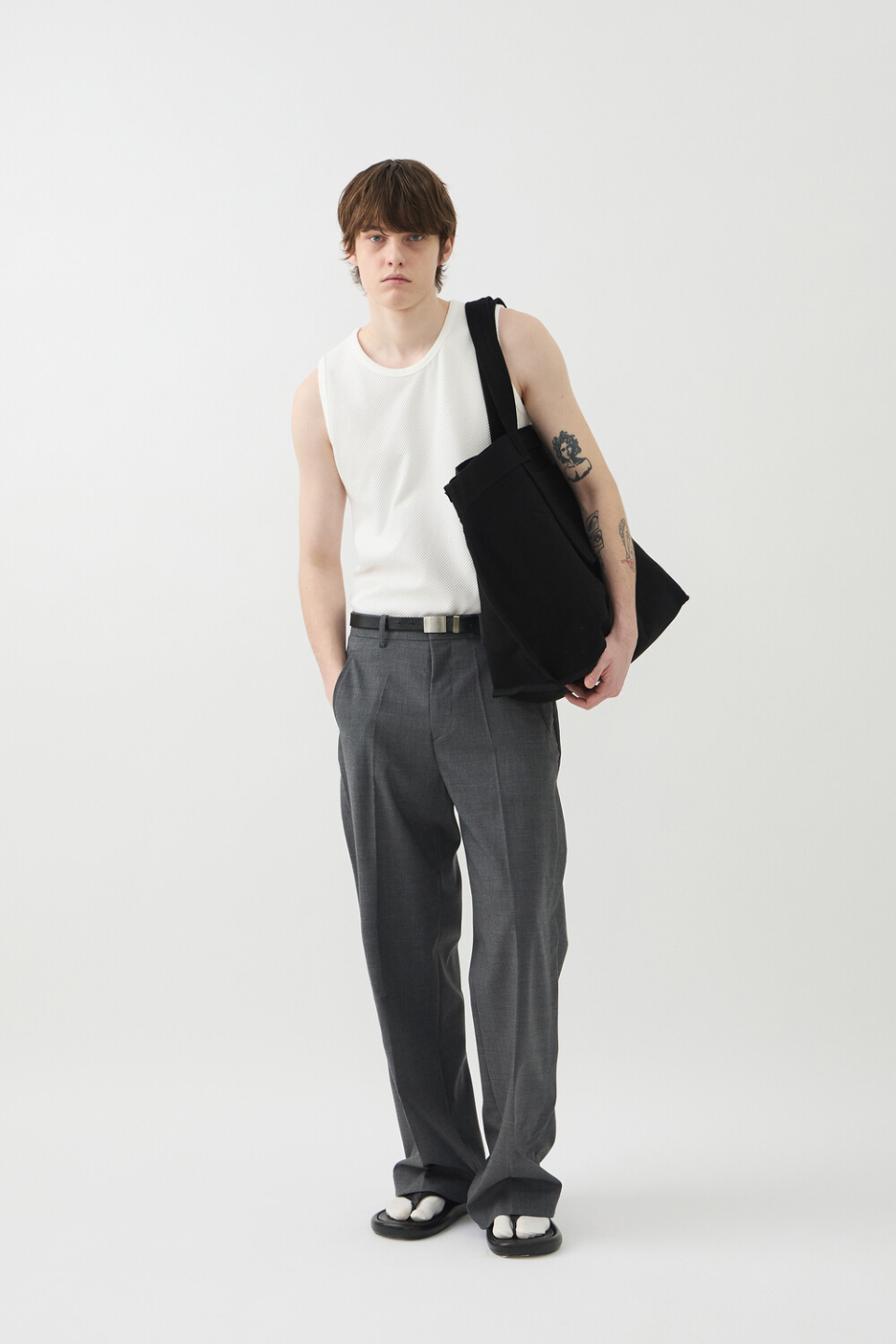-사선 립소재로 세련된 무드로 연출되는 슬리브리스 탑