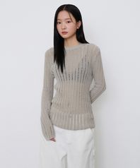 우먼즈 플랫 얀 버티컬 크로셰 크루 넥 니트 [라이트 웜 그레이]