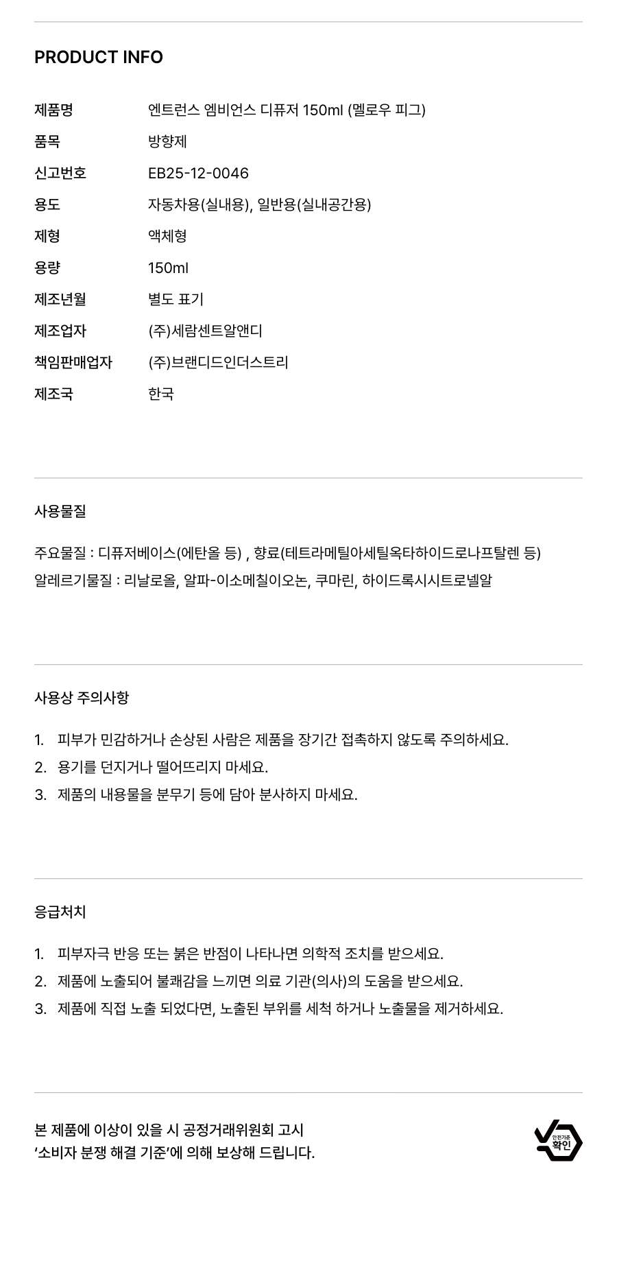 * 일부 유리병에 디퓨저 액 용량(150ml)이 아닌 용기 최대 용량(200ml)이 표기된 경우가 있습니다. 제품에는 이상이 없으니 참고 부탁드립니다.