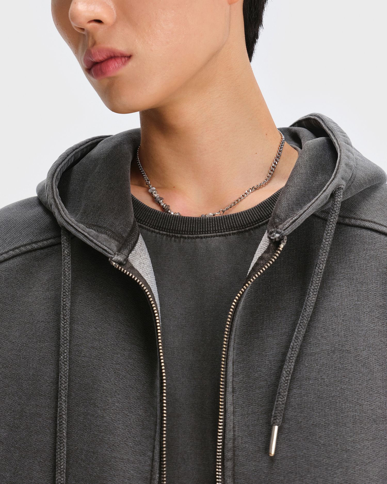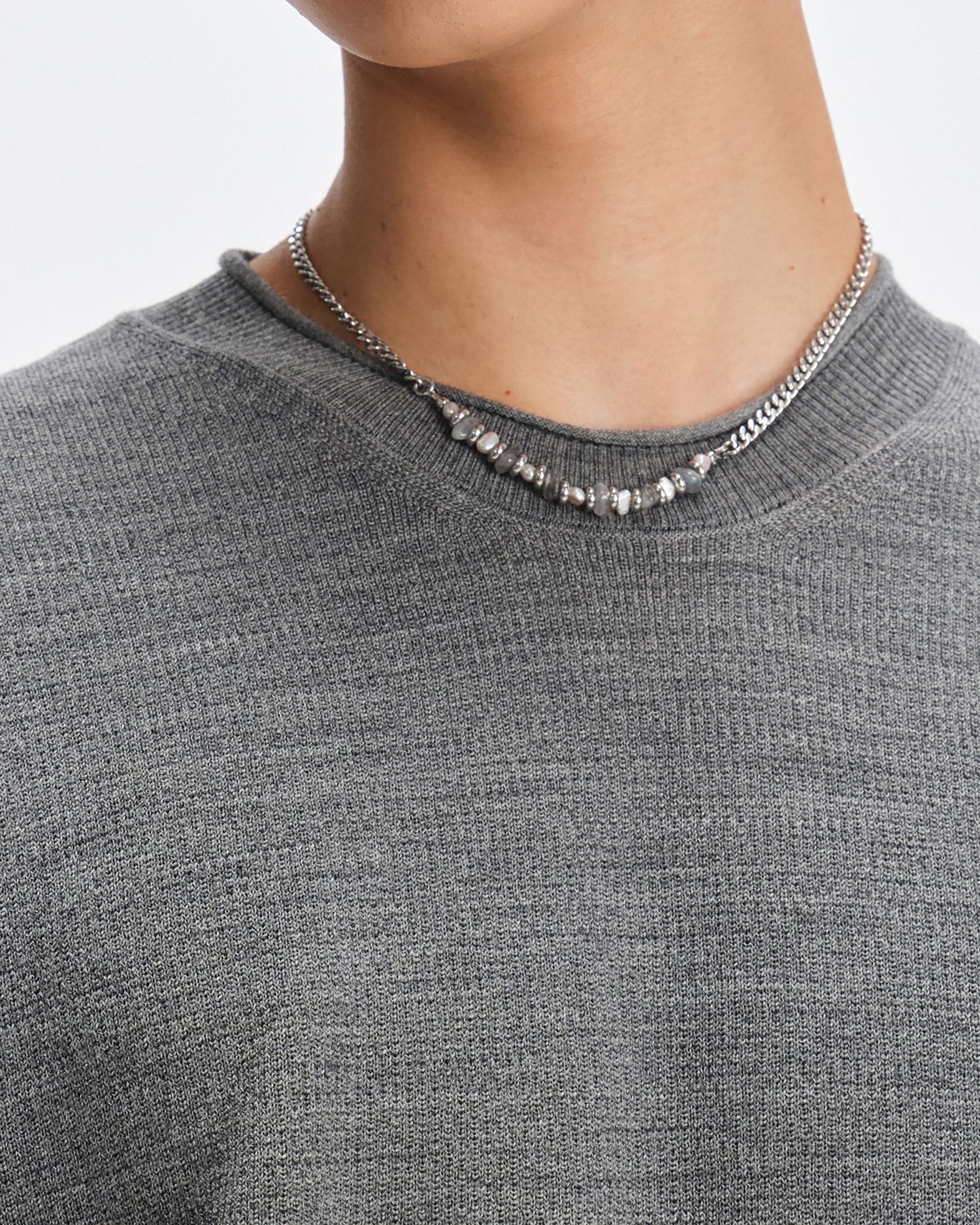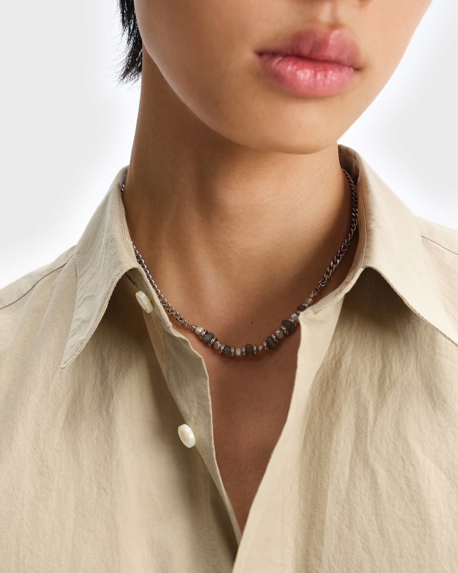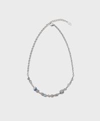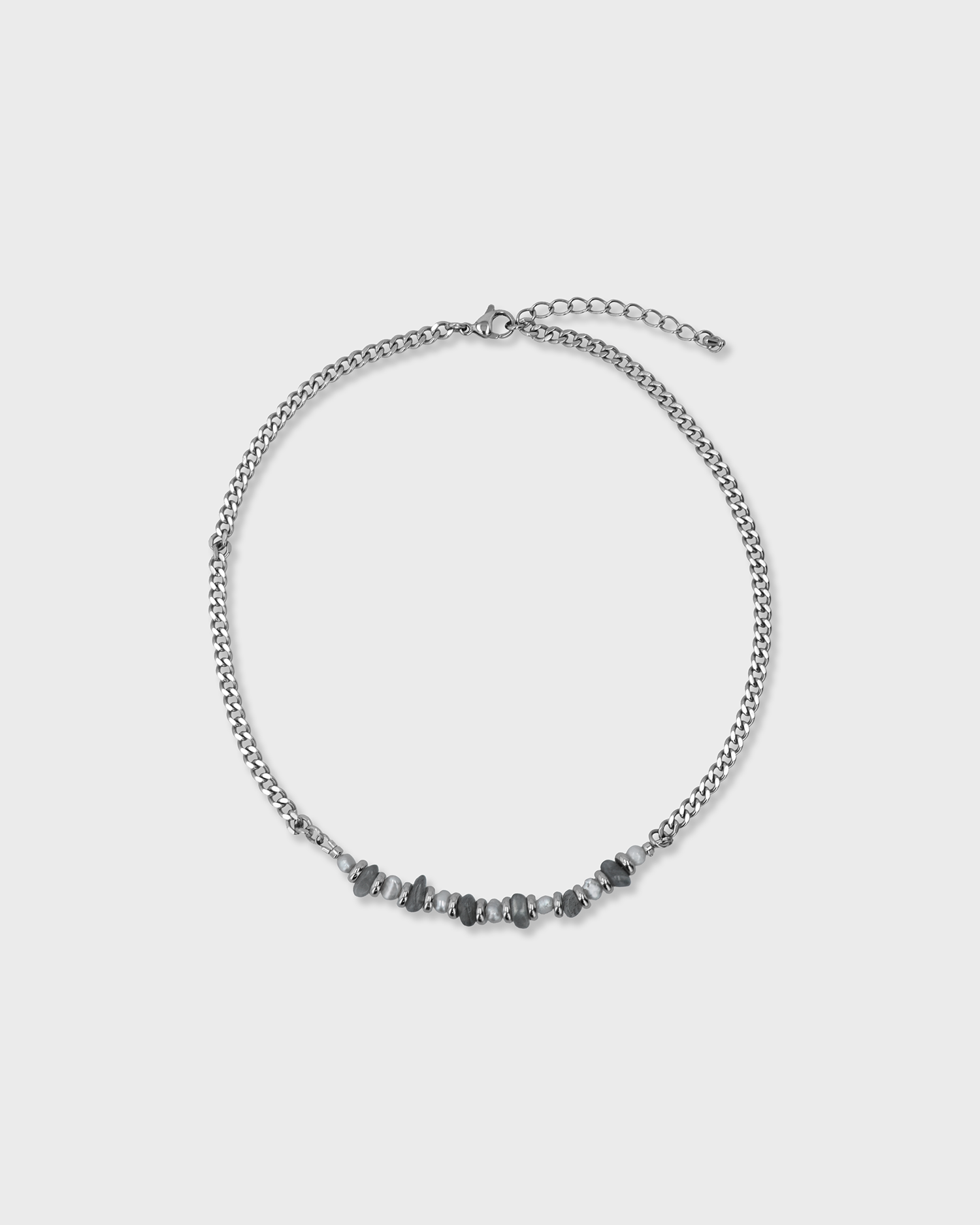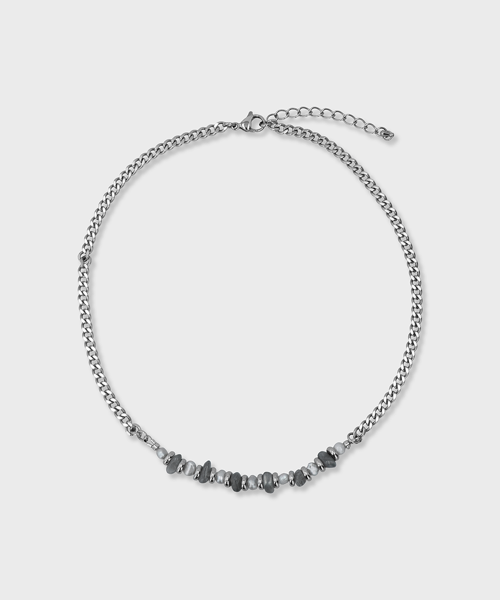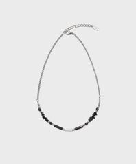 희미하게 빛나는 한 겨울의 밤을 연상케 하는 천연 원석과 메탈을 사용하여 어반 에스닉 무드로 제작한 목걸이. ※천연 원석,진주 특성상 색상의 개체 차이가 있을 수 있음.