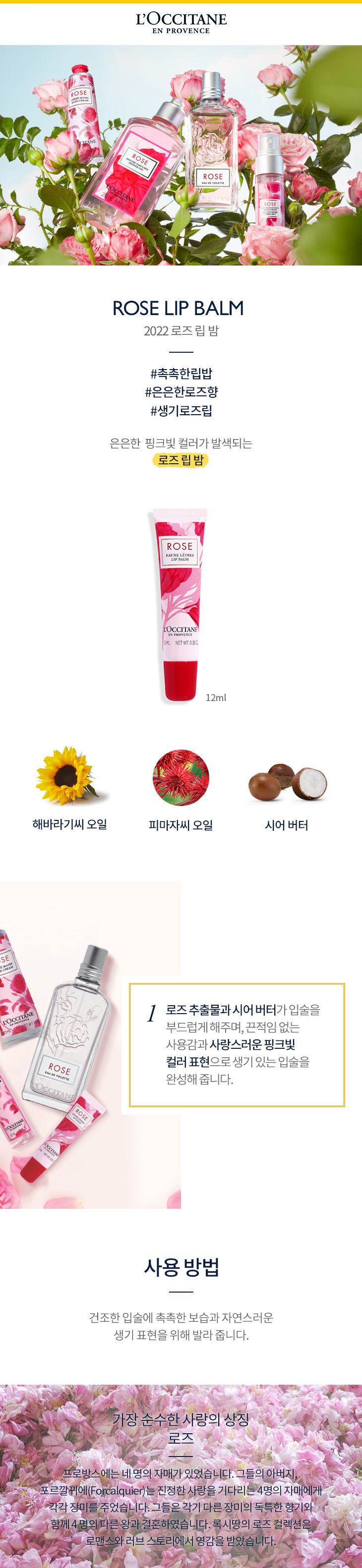 | 전성분 | 옥틸도데칸올 해바라기씨오일 카프릴릭/카프릭트라이글리세라이드 올레익/리놀레익/리놀레닉폴리글리세라이즈 피마자씨오일 글리세린 트라이하이드록시스테아린 시어버터 비즈왁스 정제수 하이드로제네이티드채종유 호호바에스터 해바라기씨왁스 하이드로제네이티드캐스터오일 프로방스장미꽃수 프로방스장미꽃추출물 그린와틀꽃왁스 폴리글리세린-3 수크랄로오스 폴리하이드록시스테아릭애씨드 토코페롤 시트릭애씨드 소듐벤조에이트 향료 리모넨 리날룰 시트로넬올 제라니올 시트랄 티타늄디옥사이드 적색201호 |