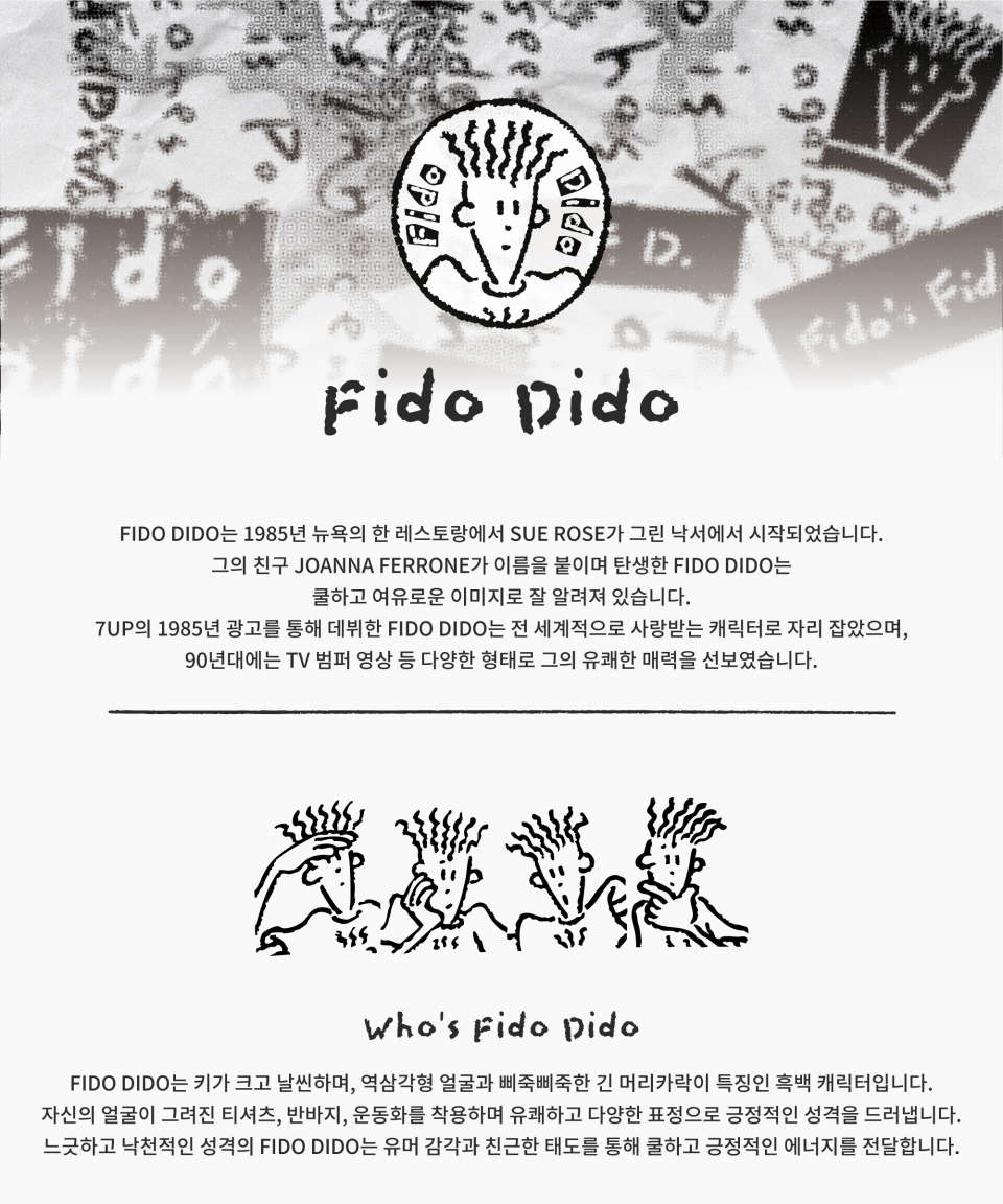 피도디도(FIDO DIDO)는 1985년 뉴욕의 레스토랑에서 SUE ROSE가 칵테일 냅킨에 그린 낙서를 본 친구 JOANNA FERRONE가 이름을 붙여 탄생한 브랜드입니다. 쿨하고 여유로운 이미지로 1988년 펩시의 7UP 커머셜에서 데뷔하여 전 세계적으로 알려지게 되었습니다. 90년대에는 TV 프로그램 사이의 범퍼 영상으로 다양한 모습을 보여주었고, 유쾌하고 여유로운 캐릭터는 'chill'한 마인드 셋을 대표하는 상징으로 자리 잡았습니다.