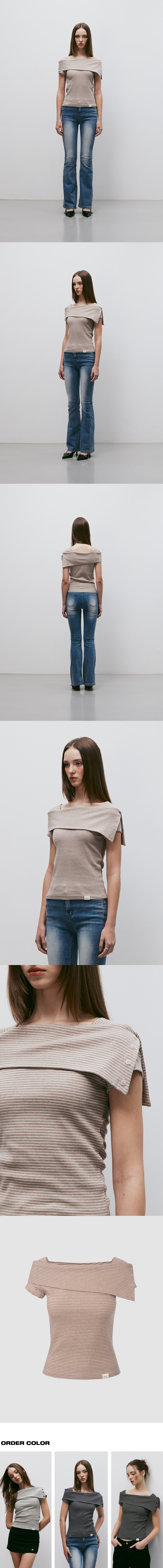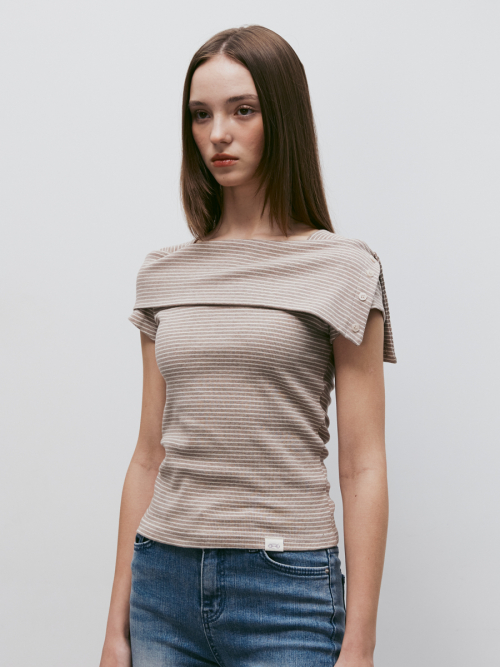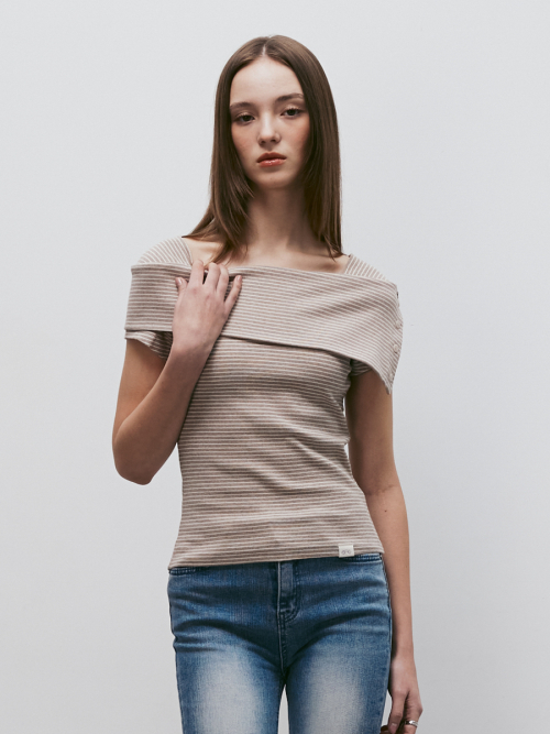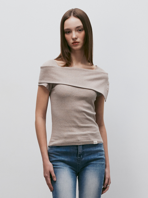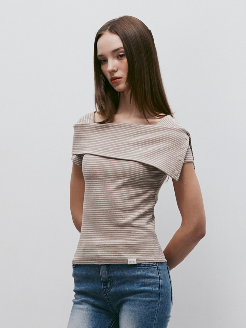 스트라이프 오프숄더 숏슬리브 티셔츠 (베이지)