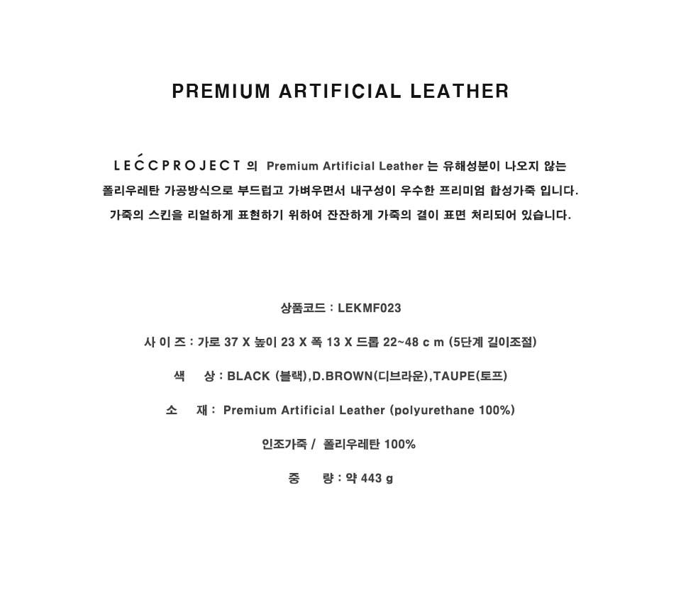 레크프로젝트(LECCPROJECT)는 '가볍고, 편하고, 멋지게' 가방이 지켜야 하는 본연의 역할을 우선으로 하는 브랜드입니다. 시크하고 쿨한 멋을 추구하며, 미니멀하면서도 모던한 디자인과 실용성까지 갖춘 제품 구성으로 멋진 라이프 스타일을 제안합니다.