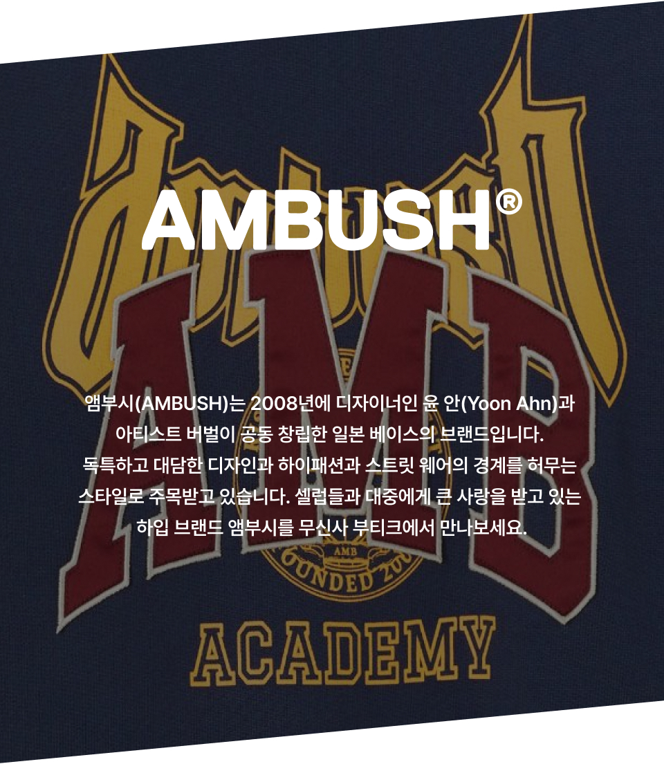 앰부시(AMBUSH)는 2008년에 디자이너인 윤 안(Yoon Ahn)과 아티스트 버벌이 공동 창립한 일본 베이스의 브랜드입니다. 독특하고 대담한 디자인과 하이패션과 스트릿 웨어의 경계를 허무는 스타일로 주목받고 있습니다. 셀럽들과 대중에게 큰 사랑을 받고 있는 하입 브랜드 앰부시를 무신사 부티크에서 만나보세요.