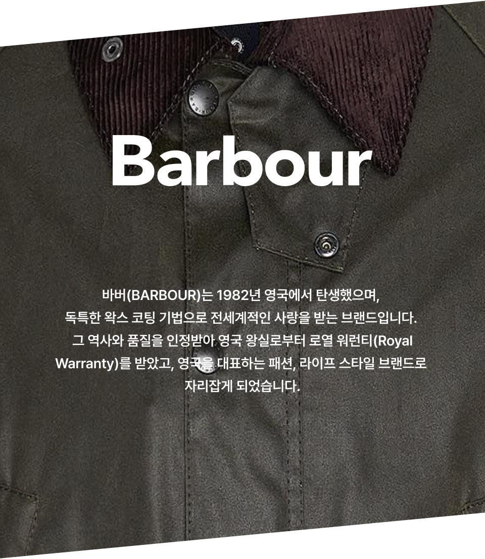 바버(BARBOUR)는 1982년 영국에서 탄생했으며, 독특한 왁스 코팅 기법으로 전세계적인 사랑을 받는 브랜드입니다. 그 역사와 품질을 인정받아 영국 왕실로부터 로열 워런티(Royal Warranty)를 받았고, 영국을 대표하는 패션, 라이프 스타일 브랜드로 자리잡게 되었습니다.