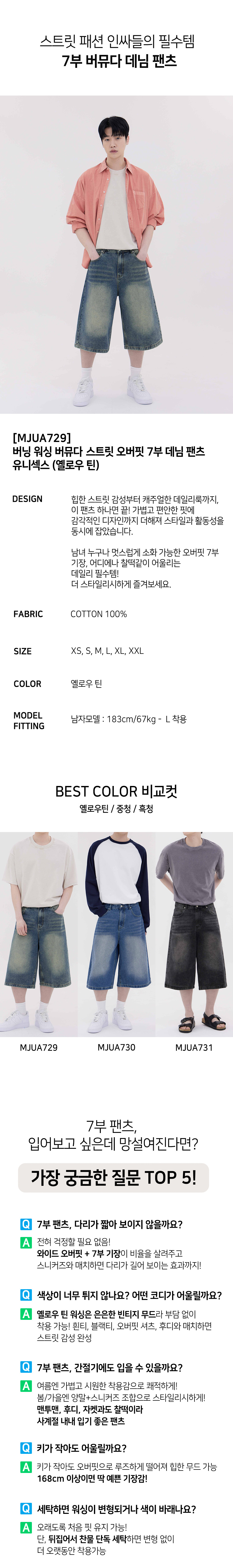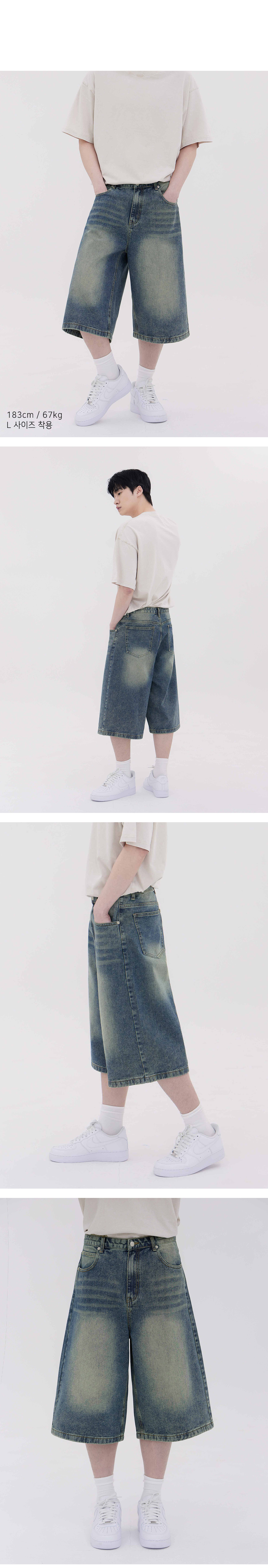버닝 워싱 버뮤다 스트릿 오버핏 7부 데님 팬츠 유니섹스 (옐로우 틴)
