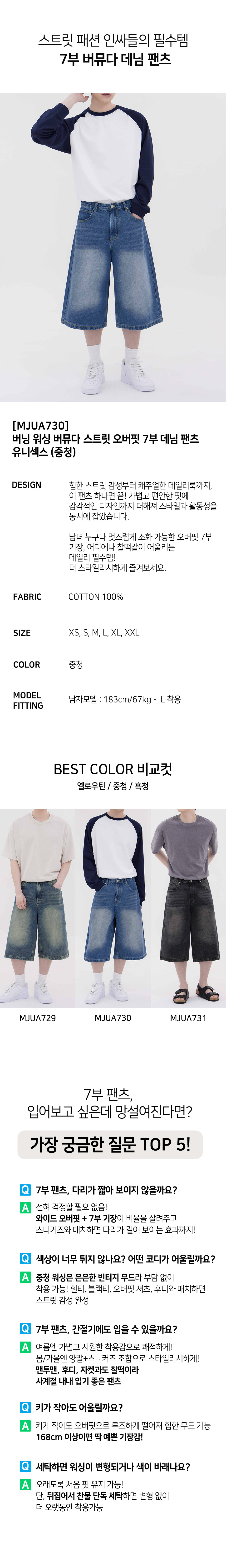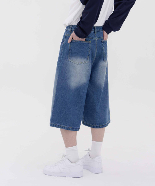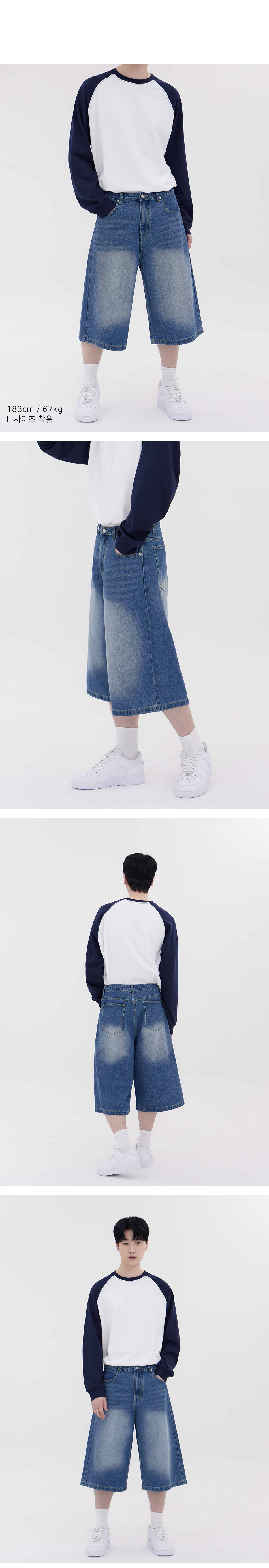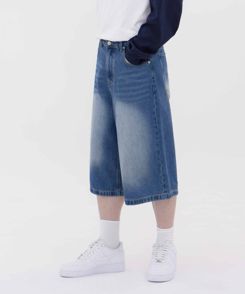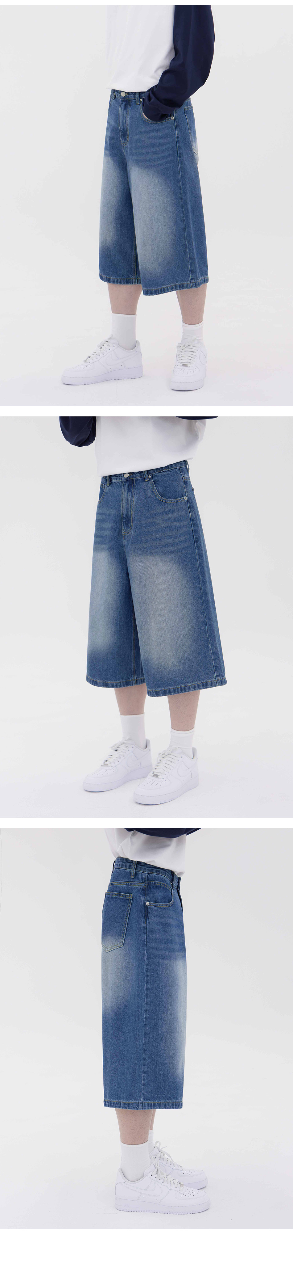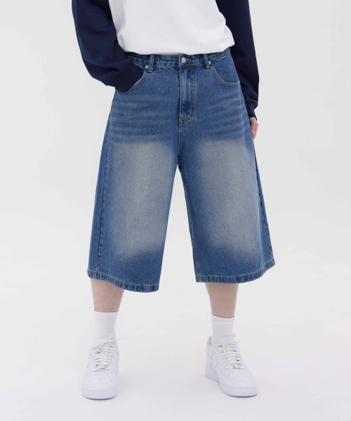 버닝 워싱 버뮤다 스트릿 오버핏 7부 데님 팬츠 유니섹스 (중청)