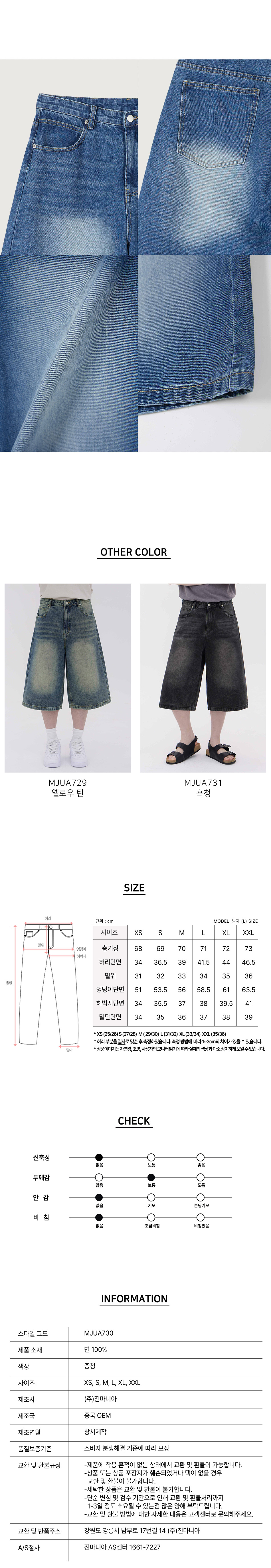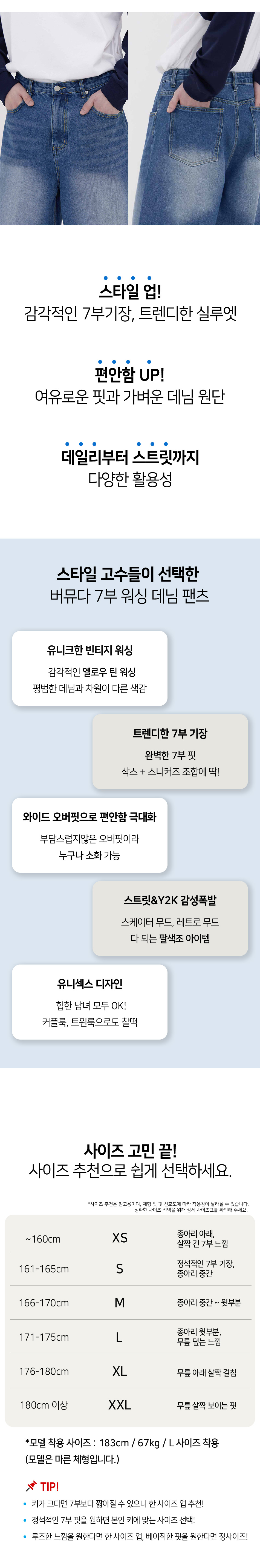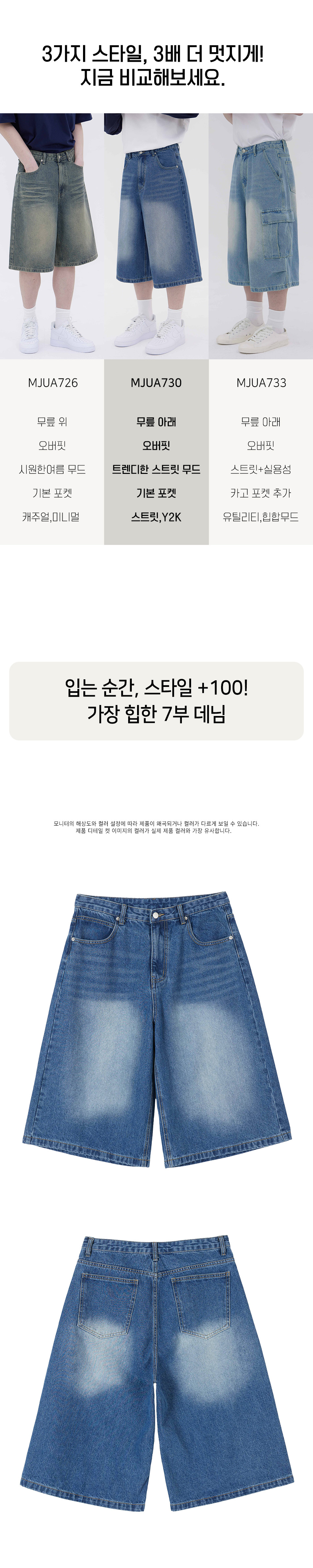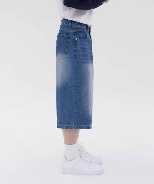 버닝 워싱 버뮤다 스트릿 오버핏 7부 데님 팬츠 유니섹스 (중청)