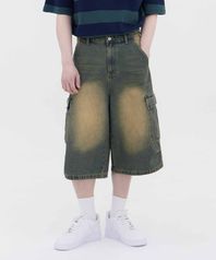 버닝 워싱 버뮤다 스트릿 카고 오버핏 7부 데님 팬츠 유니섹스 (옐로우 틴)