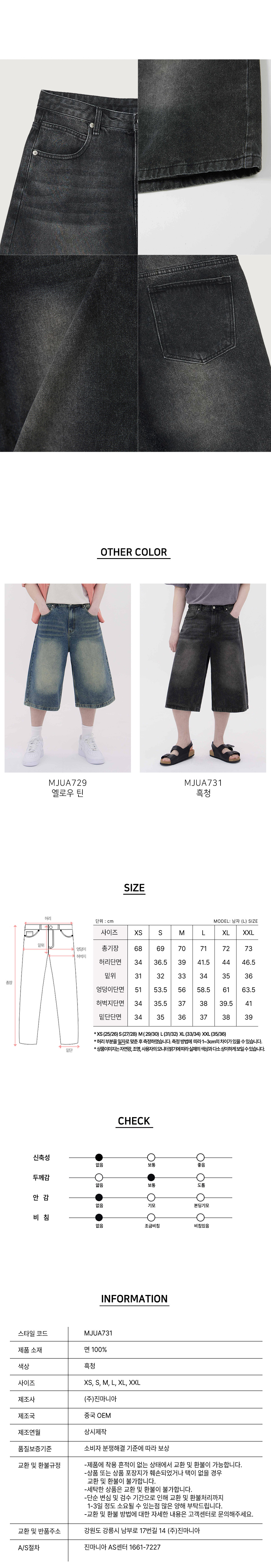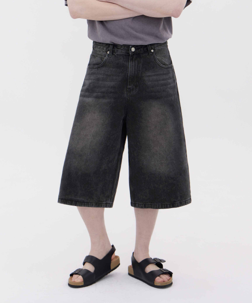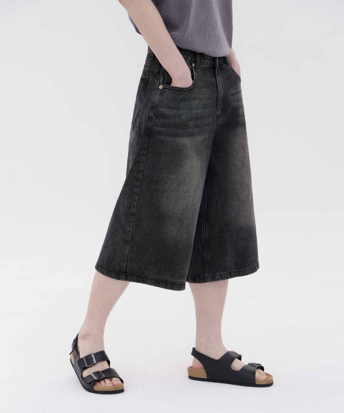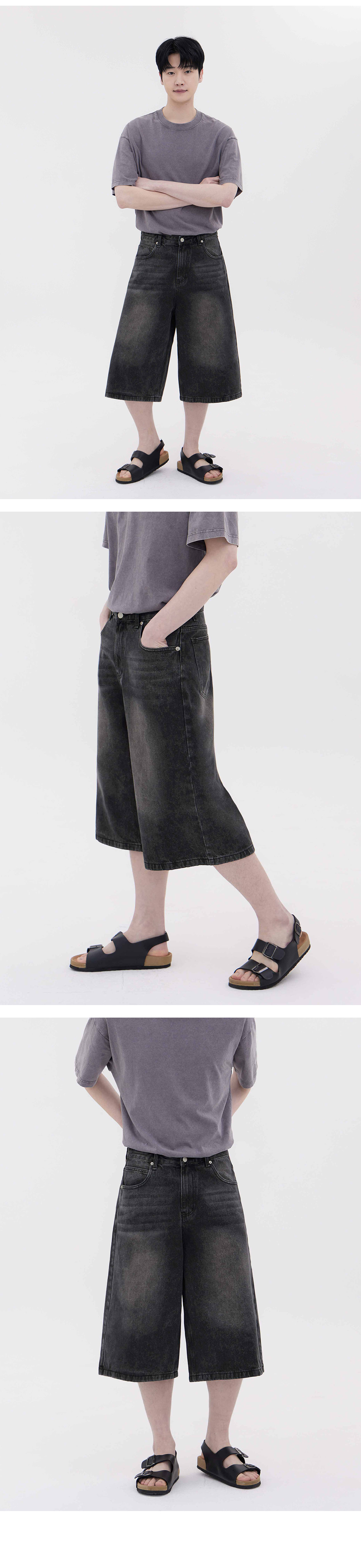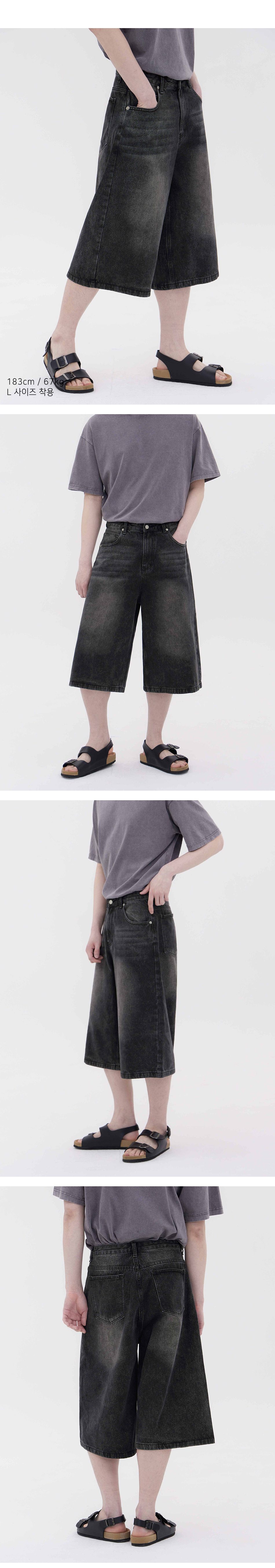 버닝 워싱 버뮤다 스트릿 오버핏 7부 데님 팬츠 유니섹스 (흑청)