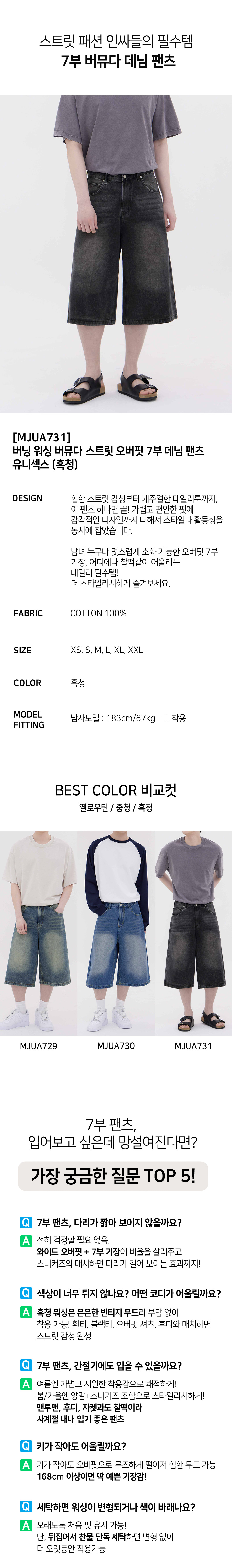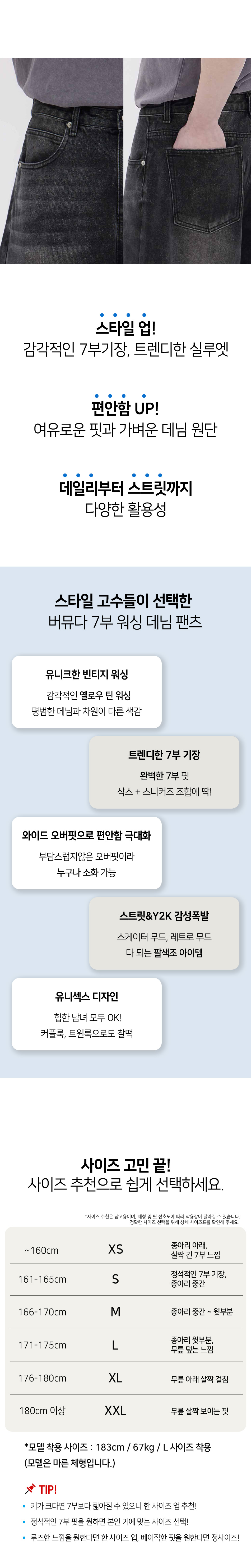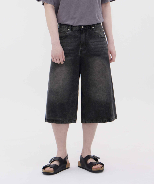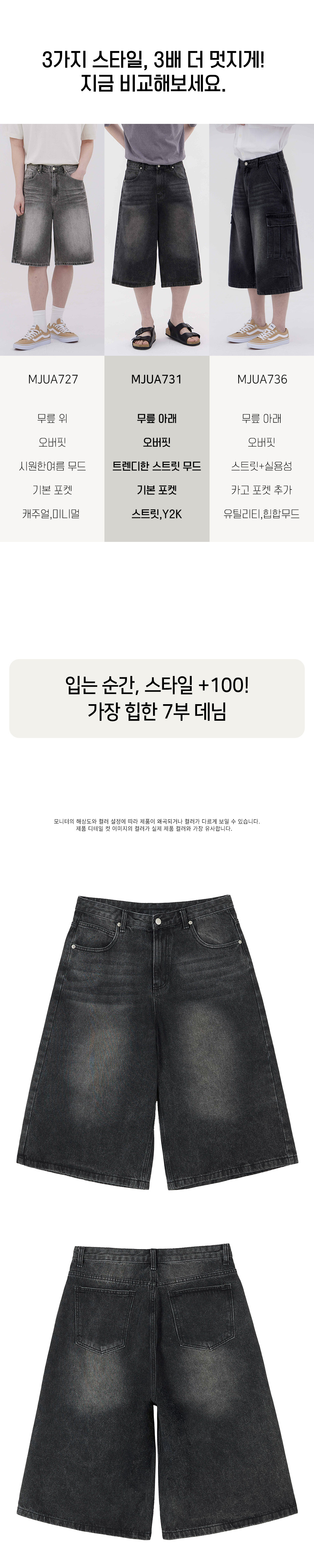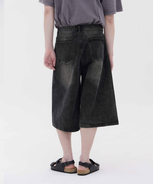 버닝 워싱 버뮤다 스트릿 오버핏 7부 데님 팬츠 유니섹스 (흑청)