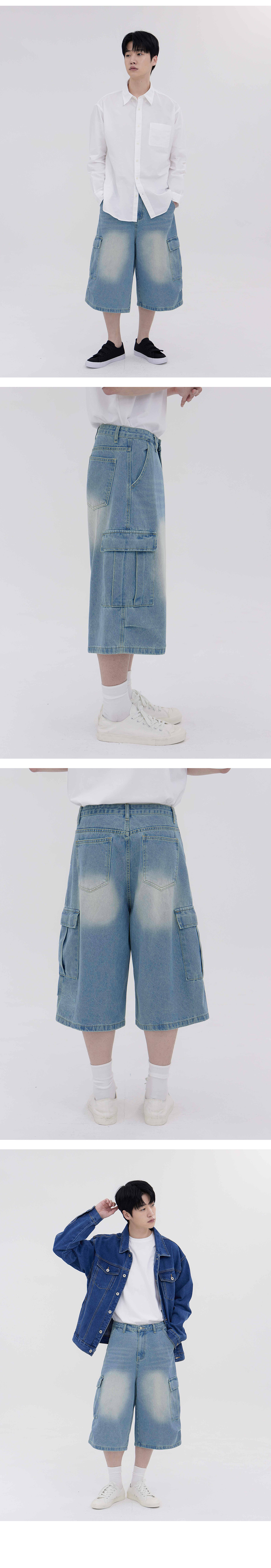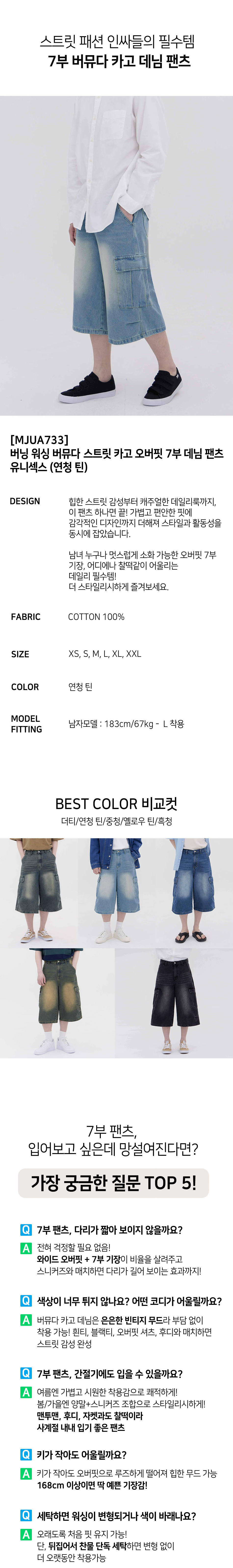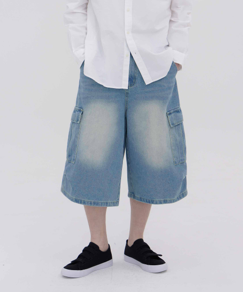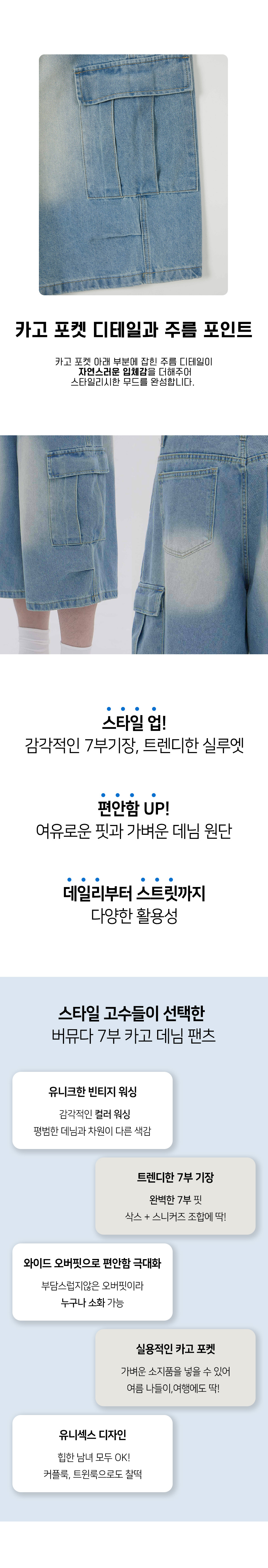 버닝 워싱 버뮤다 스트릿 카고 오버핏 7부 데님 팬츠 유니섹스 (연청 틴)
