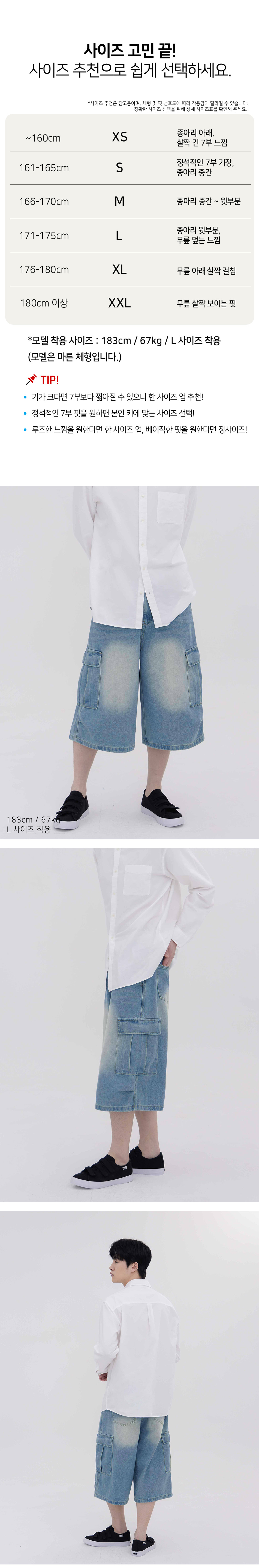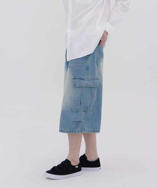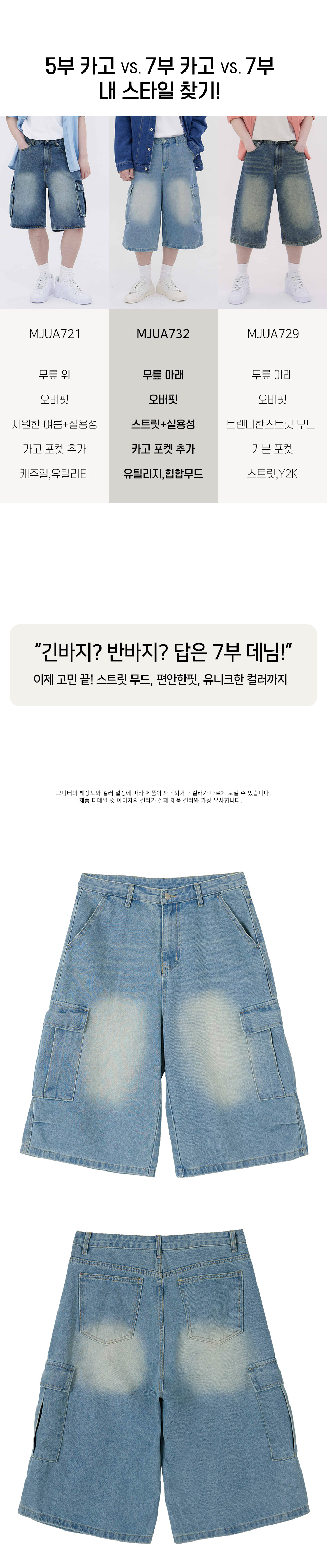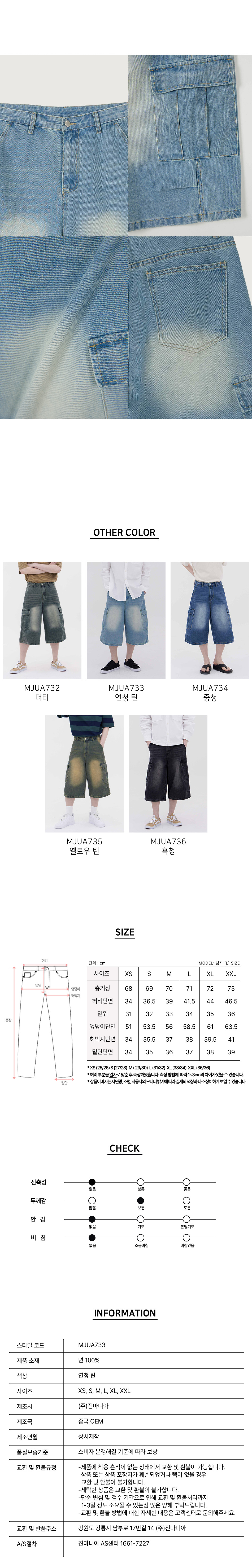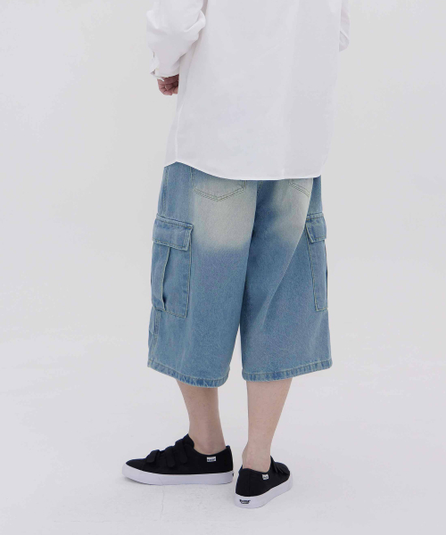 버닝 워싱 버뮤다 스트릿 카고 오버핏 7부 데님 팬츠 유니섹스 (연청 틴)