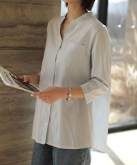 오픈 헨리넥 스트라이프 7부 블라우스