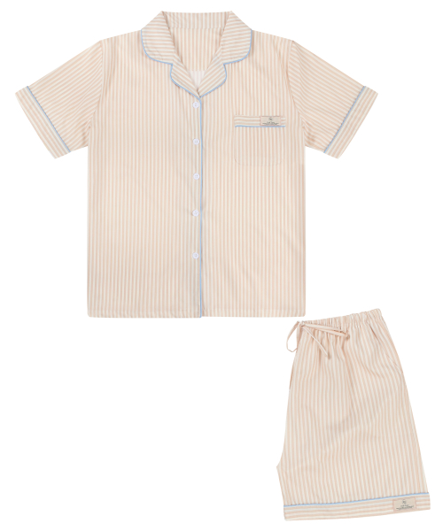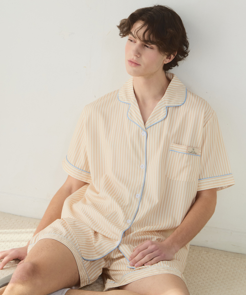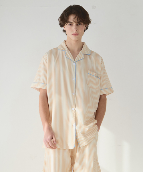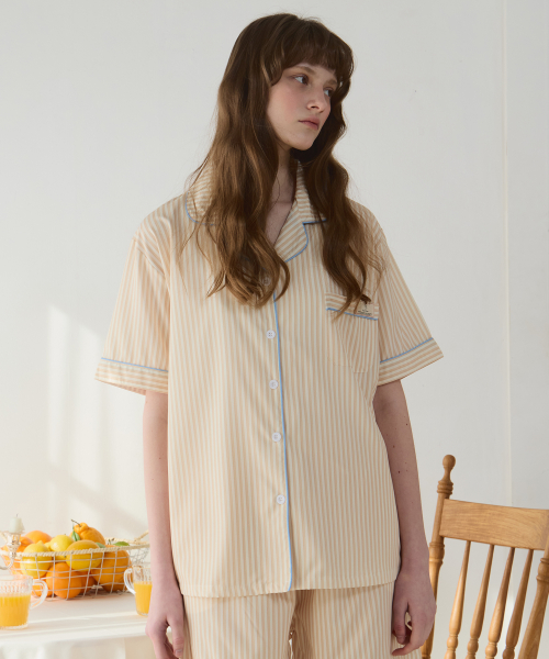 버터옐로 스트라이프 반팔 카라 투피스 잠옷 세트