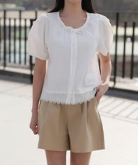 리본 라운드넥 콩단추 레이스 퍼프반팔 블라우스