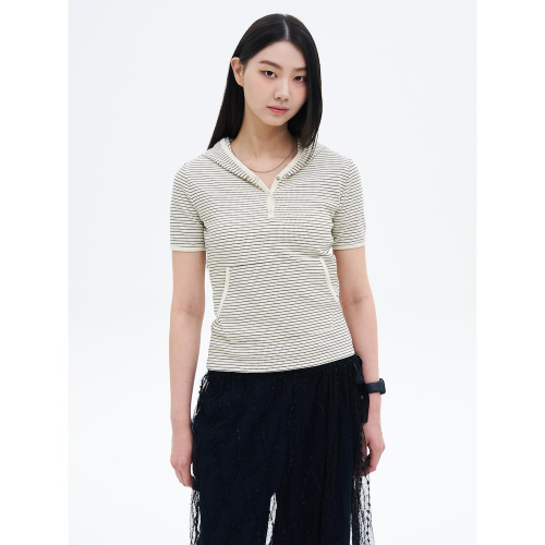 은은한 스트라이프 패턴이 돋보이는 반팔 후디 톱입니다. 버튼 디테일과 라인 배색을 더해 경쾌한 무드를 연출했으며, 데님 팬츠나 스커트 등 다양한 하의와 쉽게 매치할 수 있는 아이템입니다.