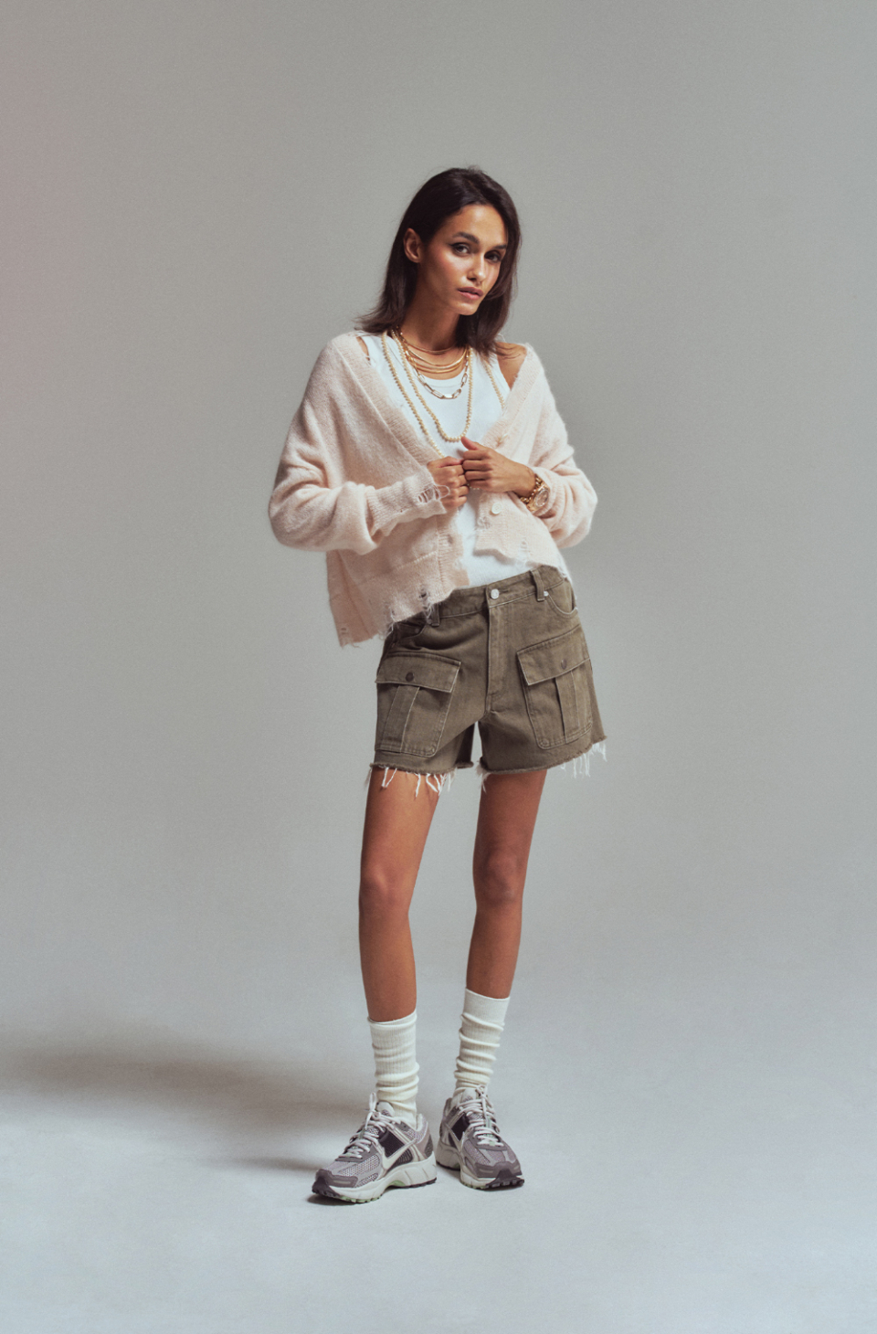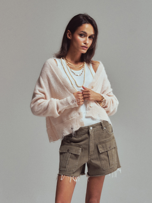 Frayed Edge Cropped Cardigan Khaki