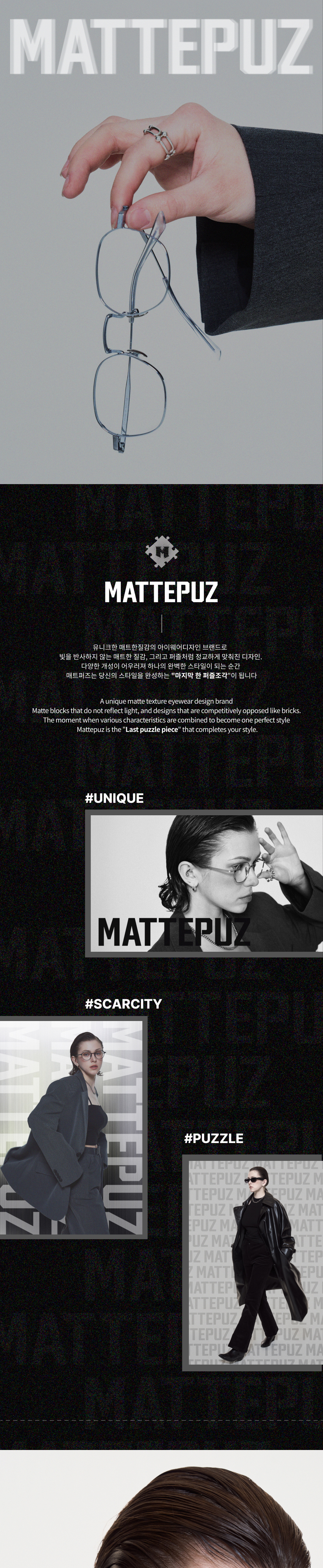 매트퍼즈(MATTEPUZ)는 유니크한 매트 질감의 아이웨어 디자인 브랜드입니다. 빛을 반사하지 않는 매트한 질감, 그리고 퍼즐처럼 정교하게 맞춰진 디자인 다양한 개성이 어우러져 하나의 완벽한 스타일이 되는 순간, 당신의 스타일을 완성하는 '마지막 한 퍼즐 조각'이 됩니다.