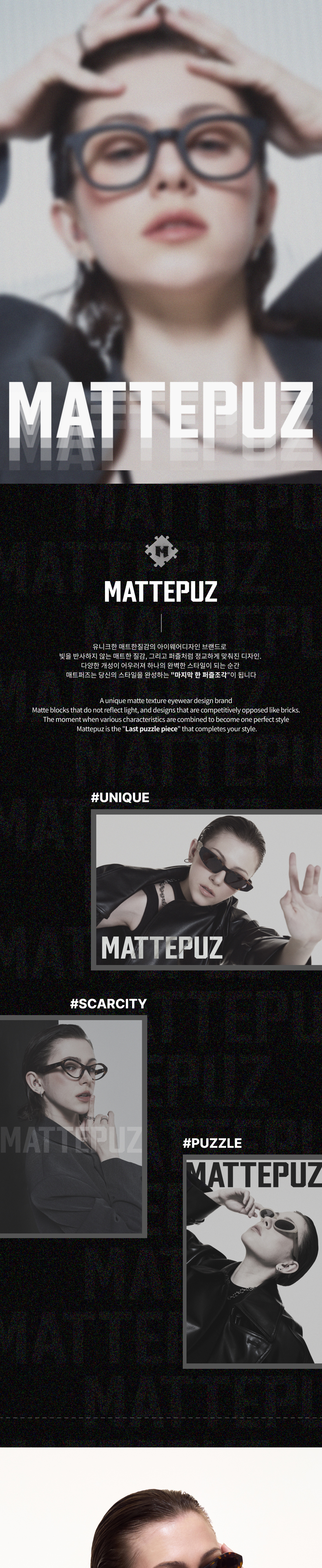매트퍼즈(MATTEPUZ)는 유니크한 매트 질감의 아이웨어 디자인 브랜드입니다. 빛을 반사하지 않는 매트한 질감, 그리고 퍼즐처럼 정교하게 맞춰진 디자인 다양한 개성이 어우러져 하나의 완벽한 스타일이 되는 순간, 당신의 스타일을 완성하는 '마지막 한 퍼즐 조각'이 됩니다.