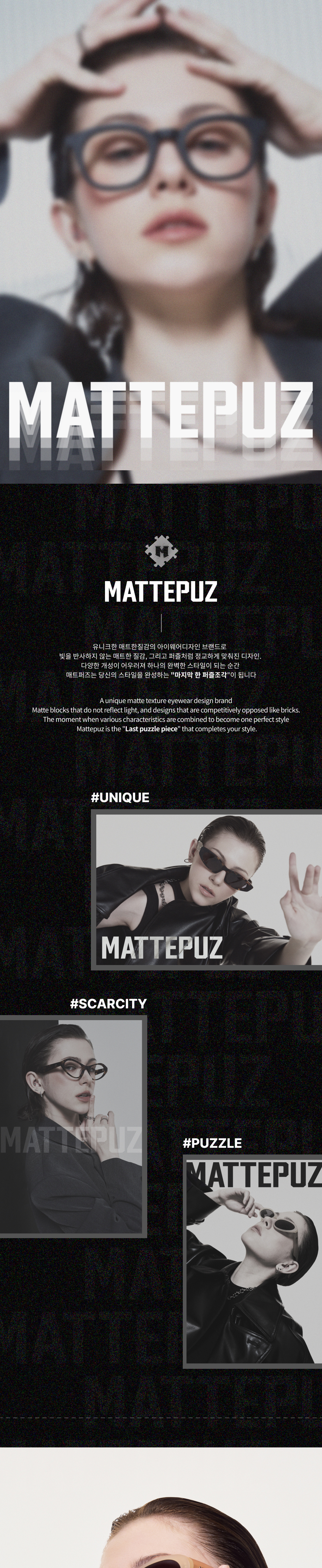 매트퍼즈(MATTEPUZ)는 유니크한 매트 질감의 아이웨어 디자인 브랜드입니다. 빛을 반사하지 않는 매트한 질감, 그리고 퍼즐처럼 정교하게 맞춰진 디자인 다양한 개성이 어우러져 하나의 완벽한 스타일이 되는 순간, 당신의 스타일을 완성하는 '마지막 한 퍼즐 조각'이 됩니다.