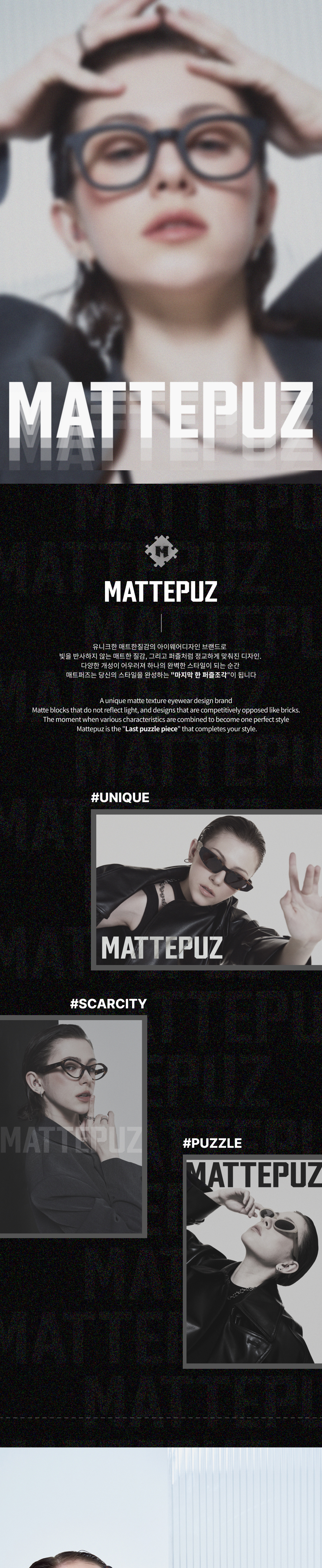 매트퍼즈(MATTEPUZ)는 유니크한 매트 질감의 아이웨어 디자인 브랜드입니다. 빛을 반사하지 않는 매트한 질감, 그리고 퍼즐처럼 정교하게 맞춰진 디자인 다양한 개성이 어우러져 하나의 완벽한 스타일이 되는 순간, 당신의 스타일을 완성하는 '마지막 한 퍼즐 조각'이 됩니다.