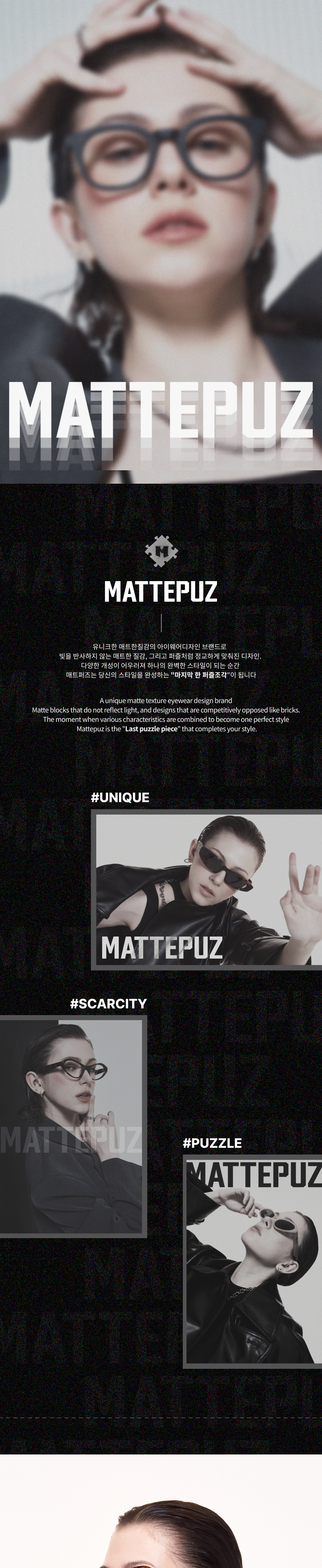 매트퍼즈(MATTEPUZ)는 유니크한 매트 질감의 아이웨어 디자인 브랜드입니다. 빛을 반사하지 않는 매트한 질감, 그리고 퍼즐처럼 정교하게 맞춰진 디자인 다양한 개성이 어우러져 하나의 완벽한 스타일이 되는 순간, 당신의 스타일을 완성하는 '마지막 한 퍼즐 조각'이 됩니다.