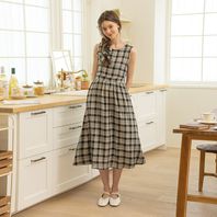 DD_Check flower sleeved dress_KHAKI BROWN