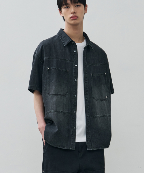 콘트라스트 빈티지 데님 하프 셔츠 [워시드블랙]