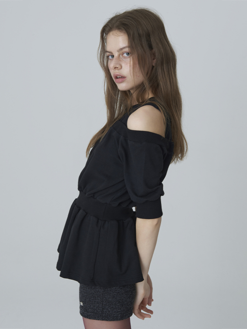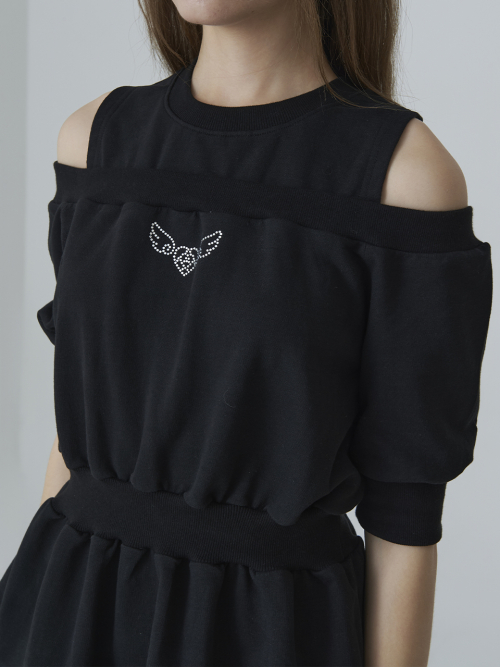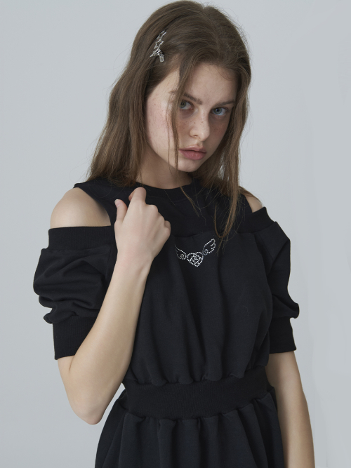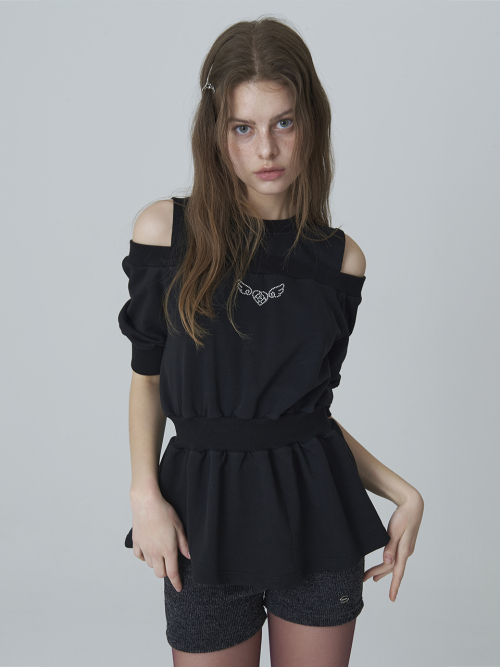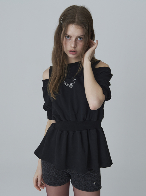 오프숄더 엔젤 큐빅 티셔츠 - 블랙