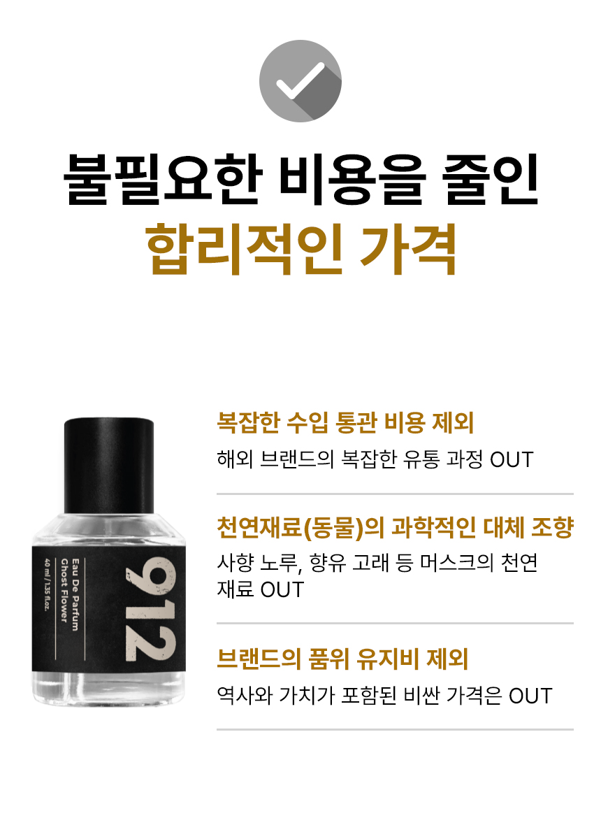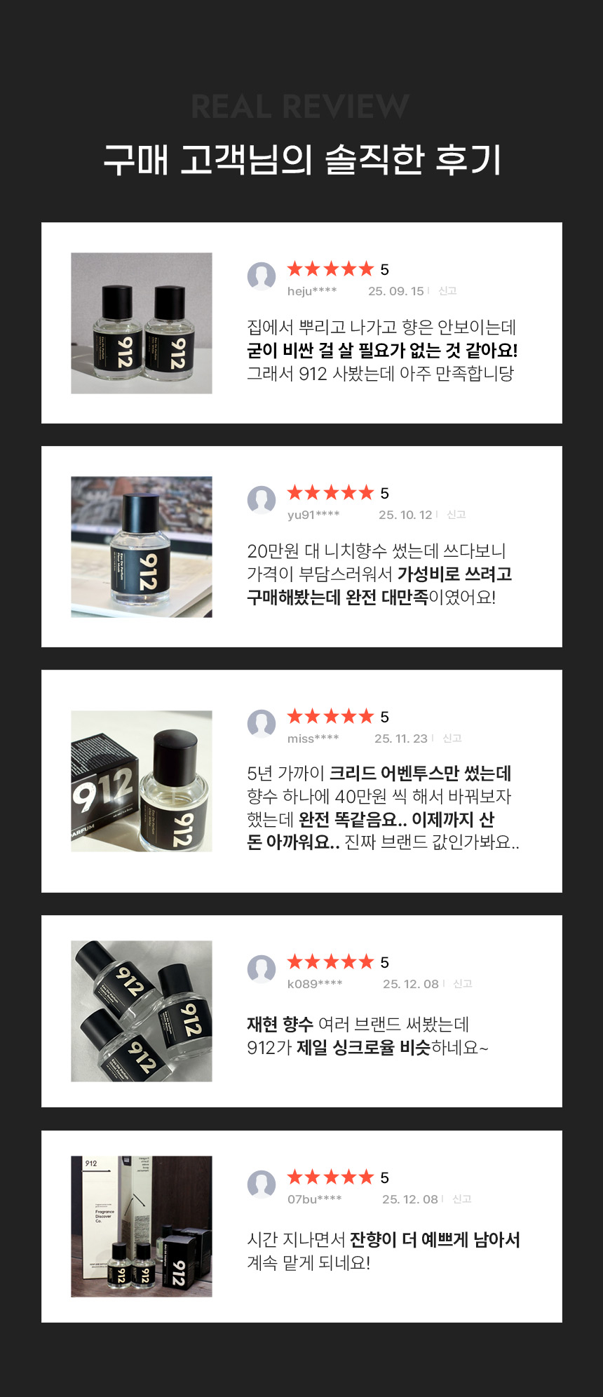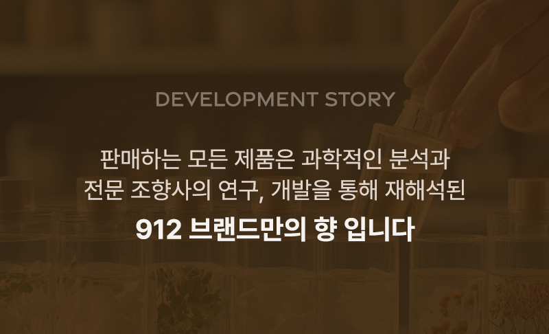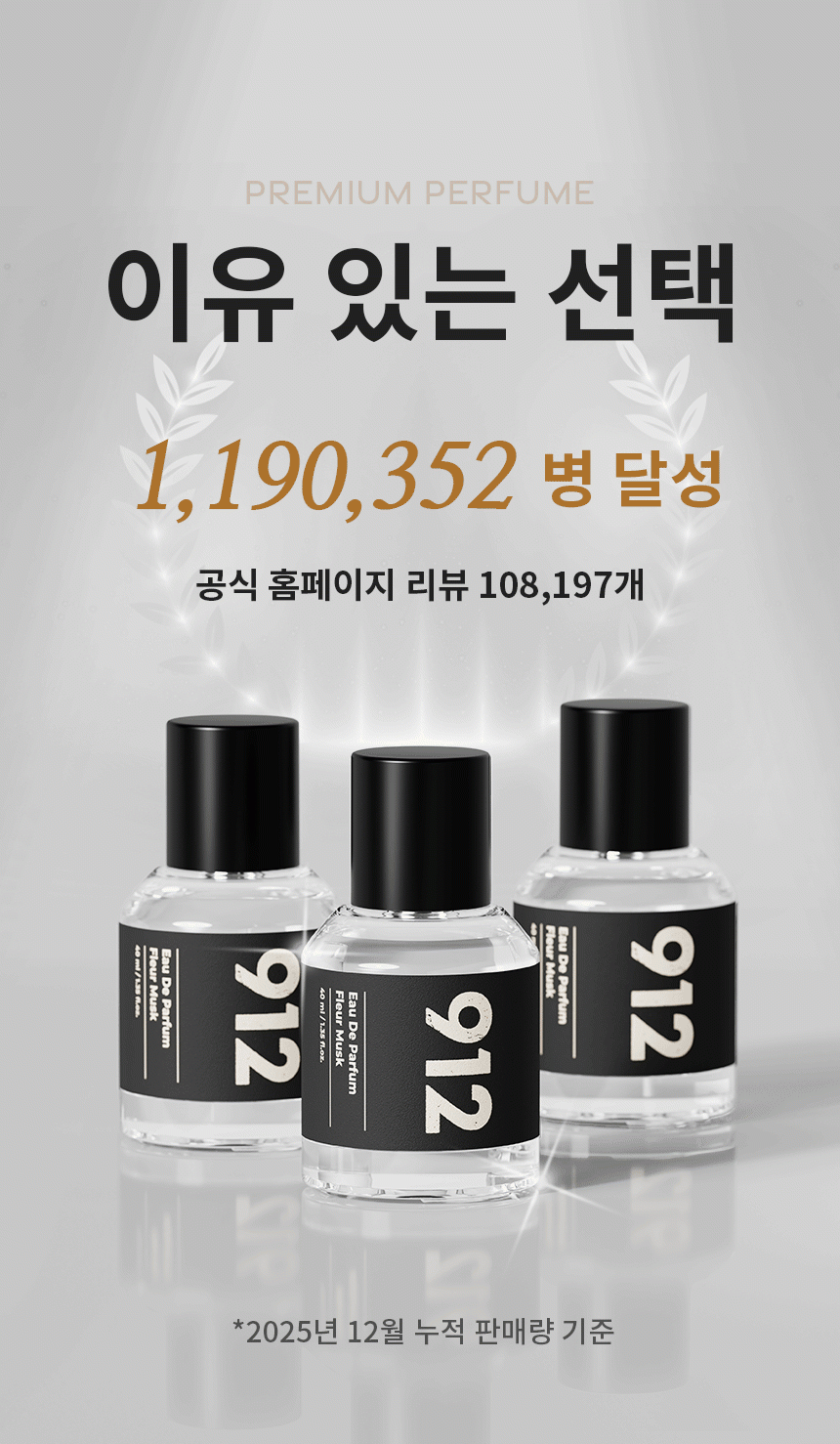 912(912)는 "좋은 향기는 좋은 기억을 만듭니다"라는 신념으로 912번의 연구 끝에 완성해 더욱 감각적이고 모던한 무드의 일상을 선물하는 라이프 스타일 프래그런스 브랜드입니다.