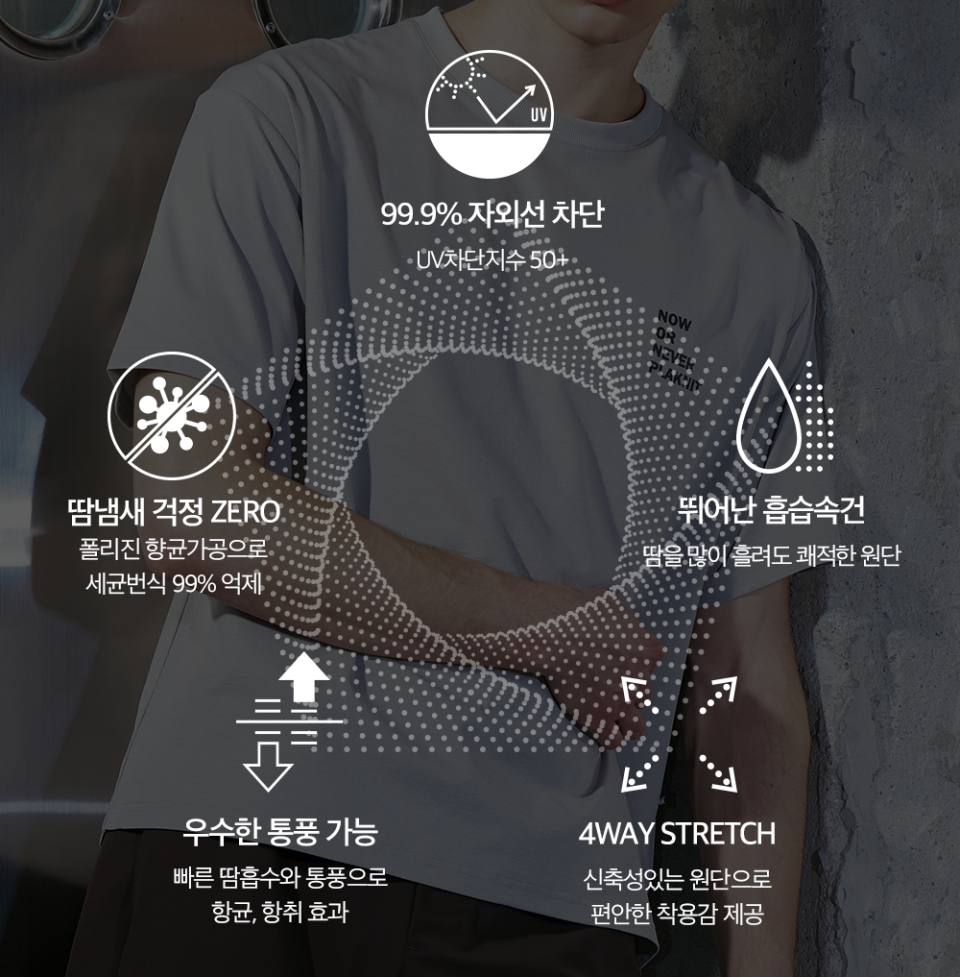 땀자국이 없는 ‘퀵드라이’는 쏟아지는 땀에도 달라붙지 않는 쾌적함이 특징입니다.