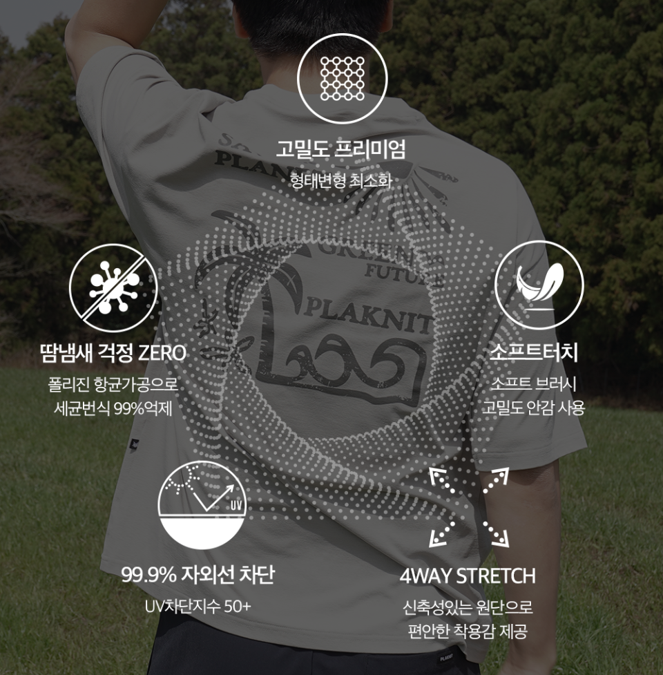 땀자국이 없는 ‘퀵드라이’는 쏟아지는 땀에도 달라붙지 않는 쾌적함이 특징입니다.