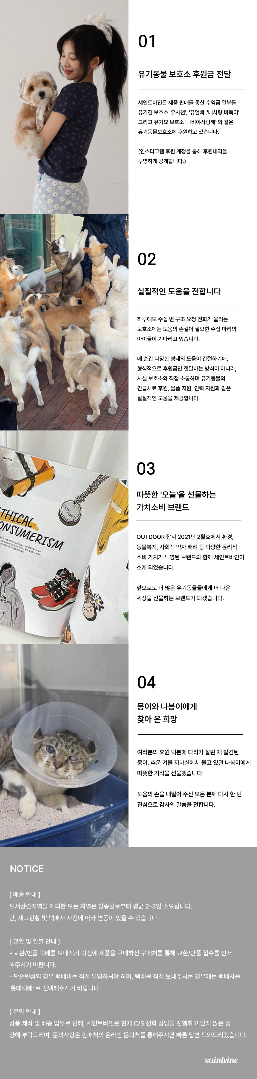세인트바인(SAINTVINE)은 유기동물에게 따뜻한 오늘을 선물하기 위해 만들어진 가치소비 브랜드입니다. 한 해 발생하는 유기동물은 약 12만 마리이며, 이 중 주인을 찾아 따뜻한 집으로 돌아가거나 새로운 주인을 만나는 경우는 절반도 채 되지 못합니다. 주인을 찾지 못한 유기동물의 대부분은 보호소 안에서 영문도 모른 채 죽음을 맞이하게 됩니다. 세인트바인은 이러한 유기동물의 더 나은 미래를 위해 앞장서고자 합니다.