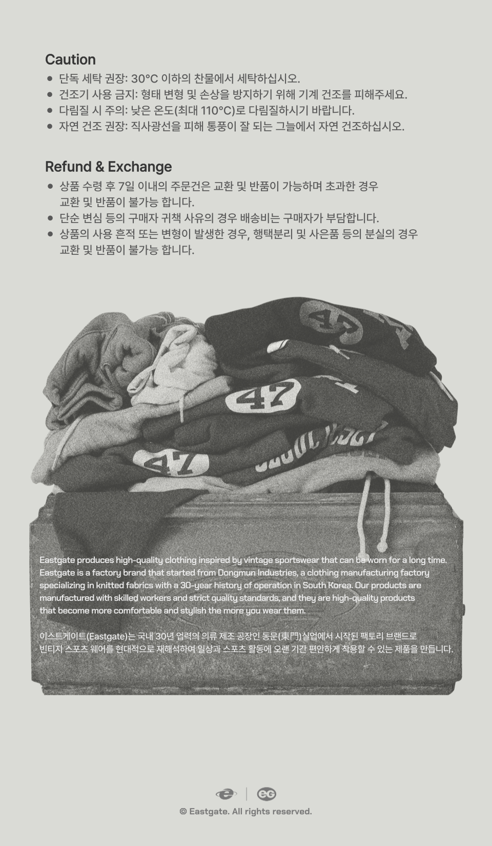 이스트게이트(EASTGATE)는 빈티지 스포츠 웨어를 현대적으로 재해석하여 오랜 기간 착용 가능한 높은 품질의 제품을 생산하며 일상과 스포츠 활동에 편안하게 착용할 수 있는 스포츠 웨어를 만드는 브랜드입니다.