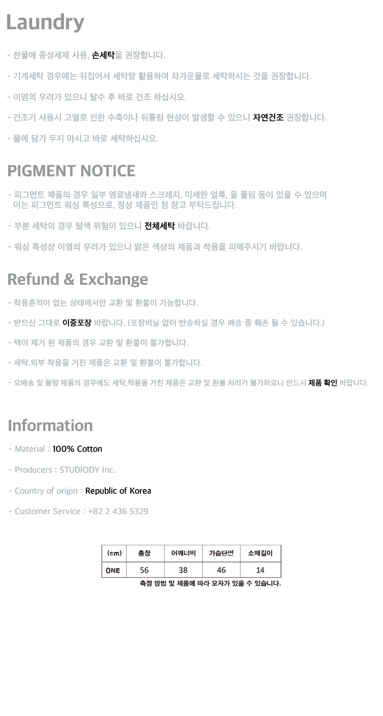 옷의 형태를 '한결같이' 유지하기 위하여 텐타, 덤블 가공으로 원단 수축율과 뒤틀림을 최소화하였습니다.