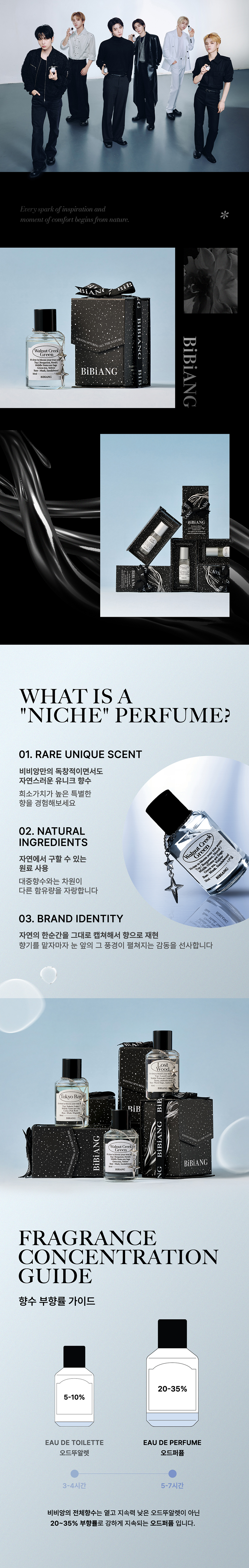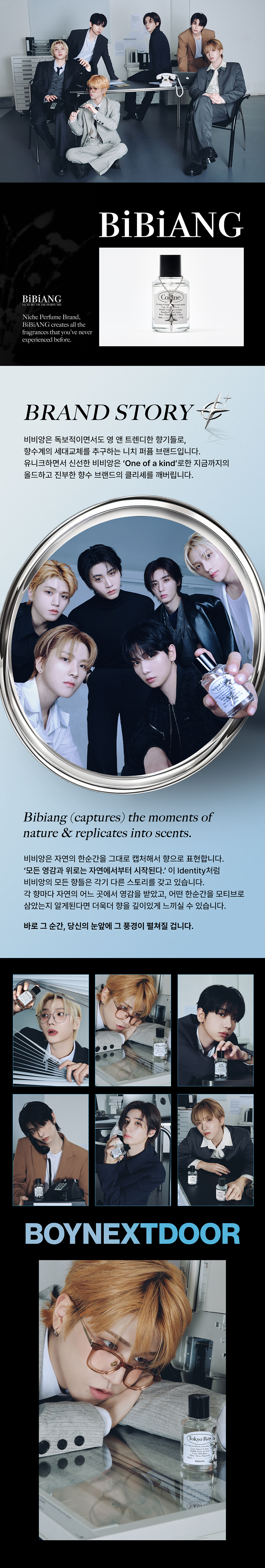 비비앙(BIBIANG)은 독보적이면서도 유니크하고, 영 앤 트렌디한 향기들로 향수계의 세대 교체를 추구하는 센세이셔널한 니치 퍼퓸 브랜드입니다. 자연의 한순간을 그대로 캡처해서 향으로 표현하며, 각 향마다 독특한 스토리텔링을 담고 있습니다.