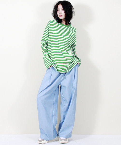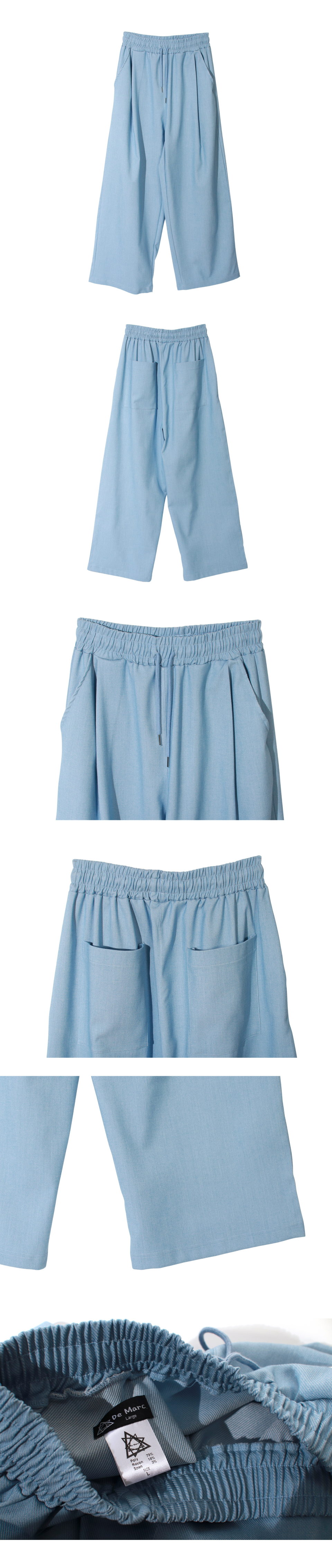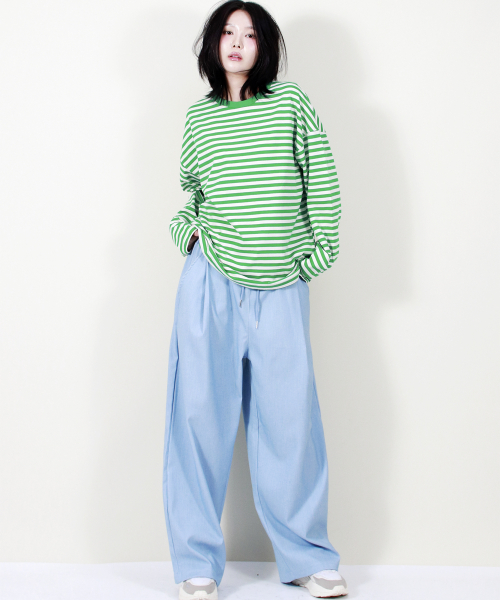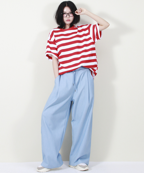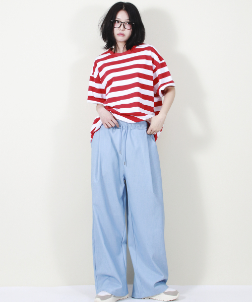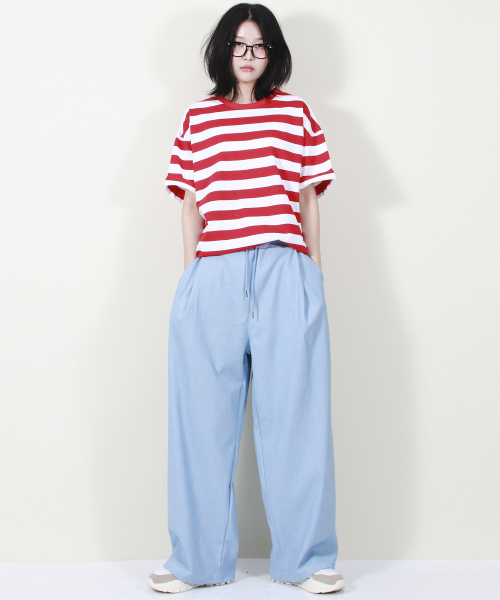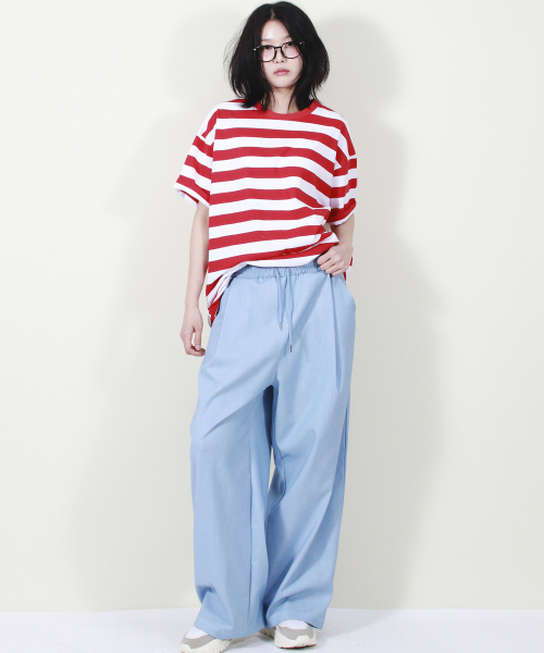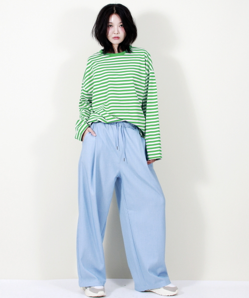 여유 있는 와이드 핏의 데님 컬러 밴딩 슬랙스입니다.