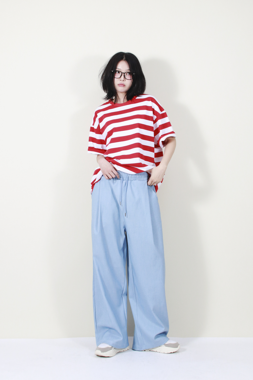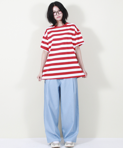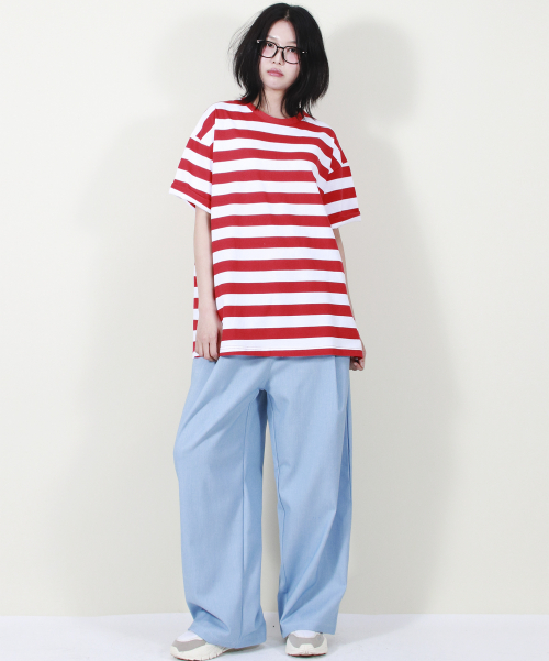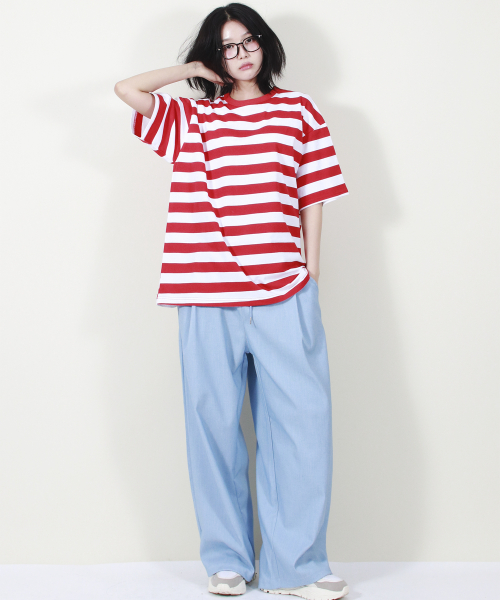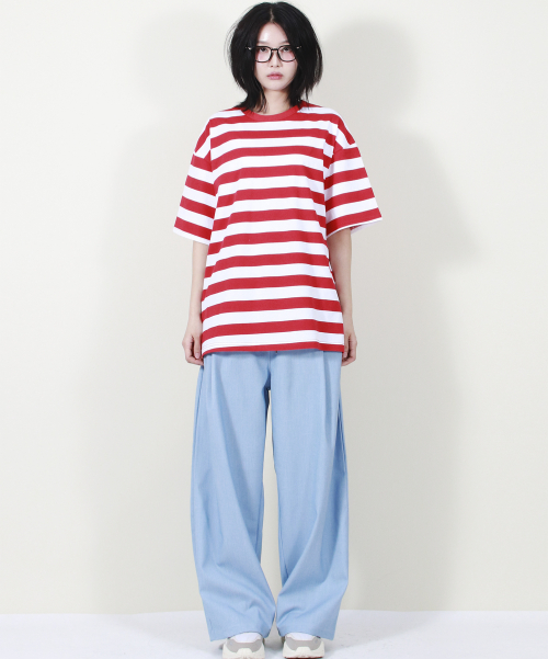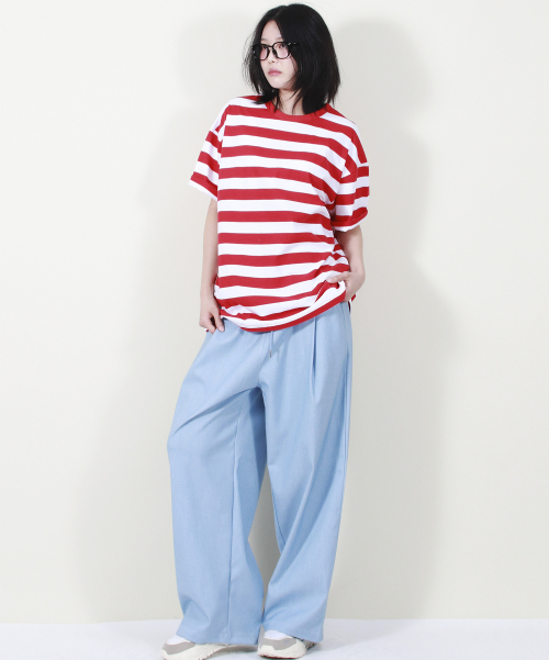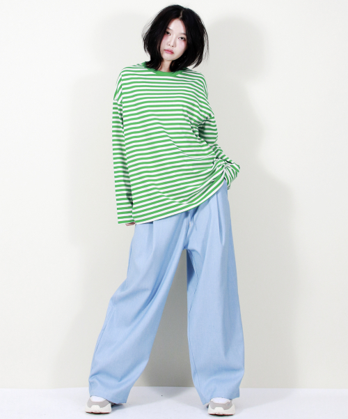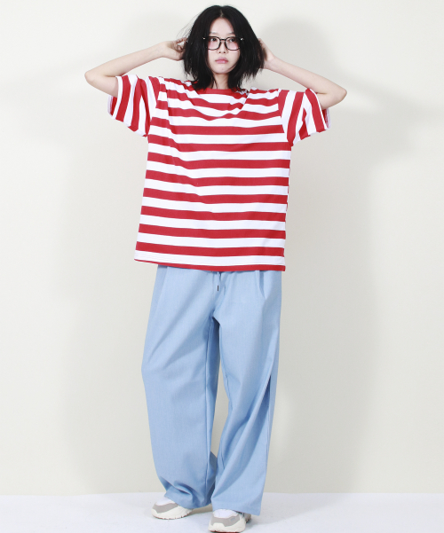 여유 있는 와이드 핏의 데님 컬러 밴딩 슬랙스입니다.
