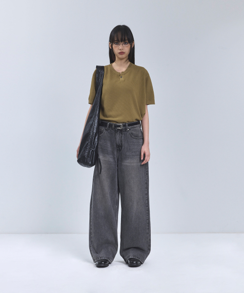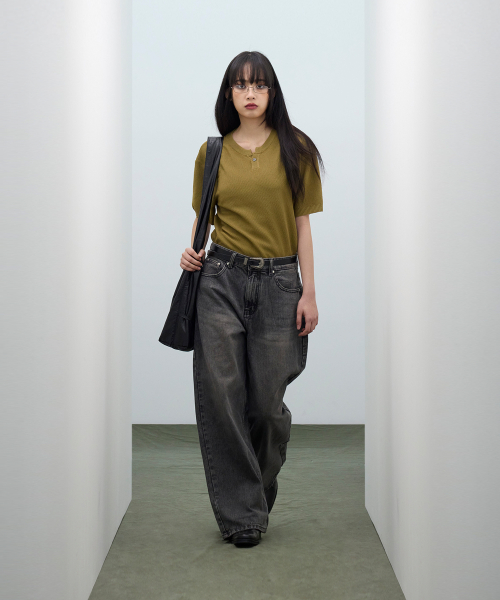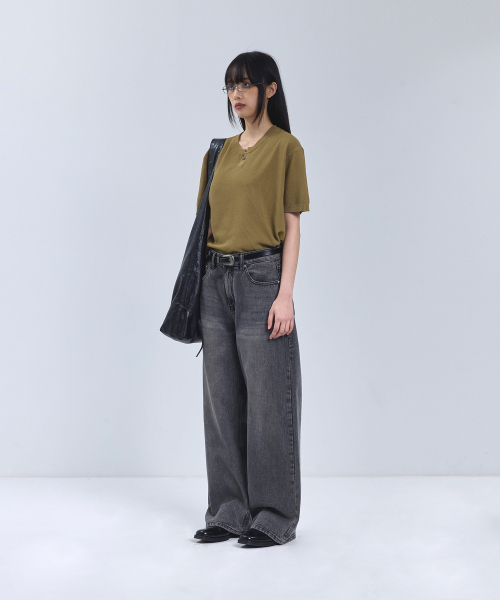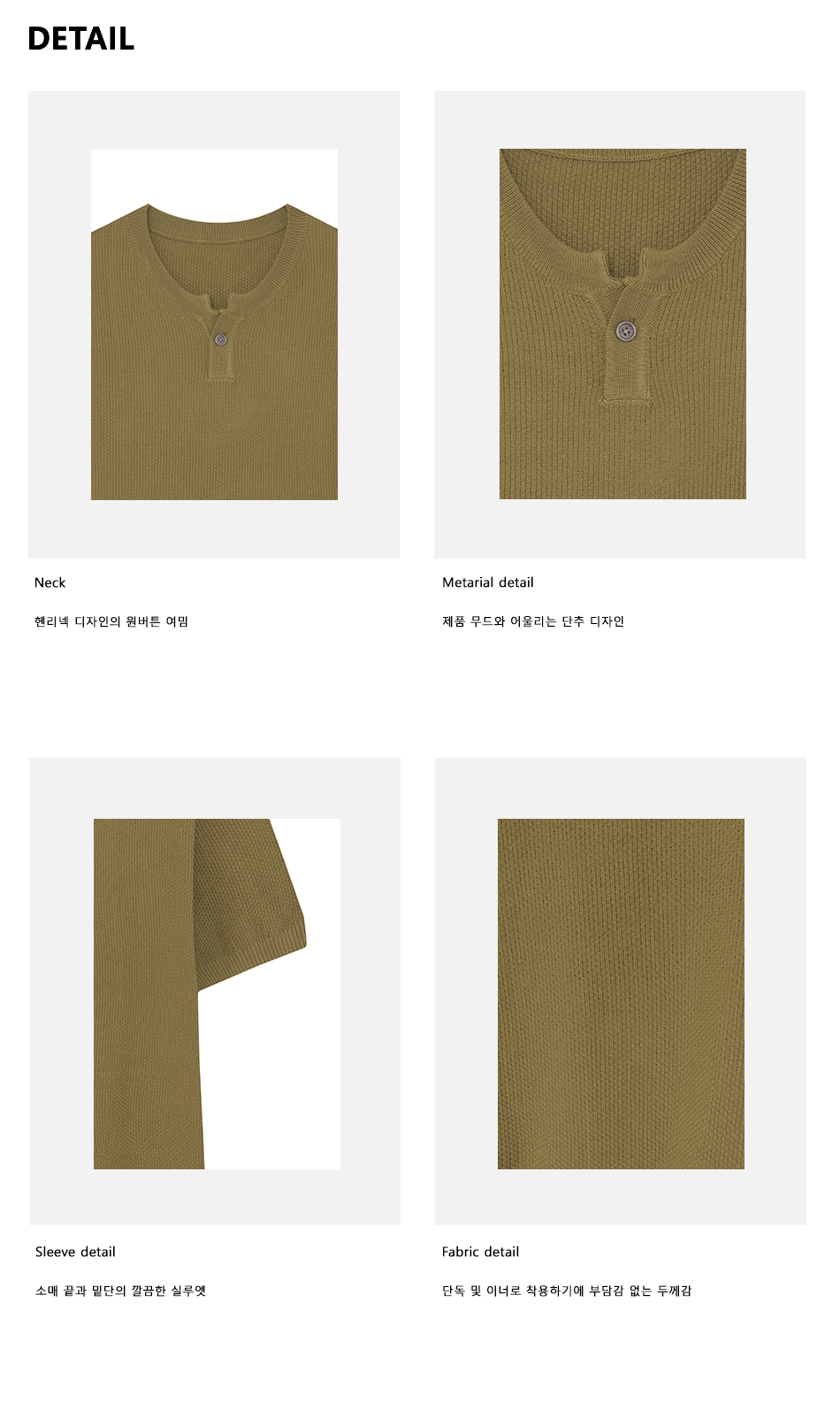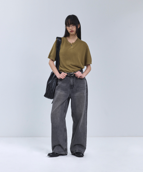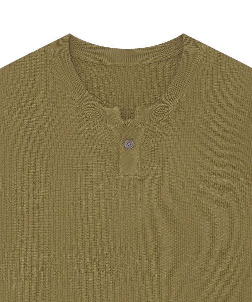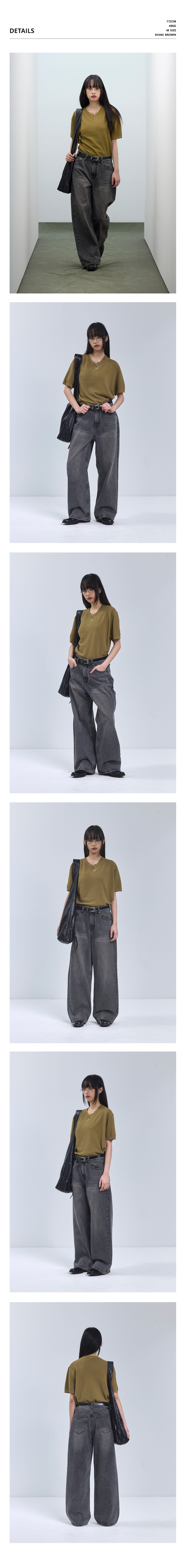 86-IRO355 베이직 원버튼 라운드 반팔 니트 카키브라운