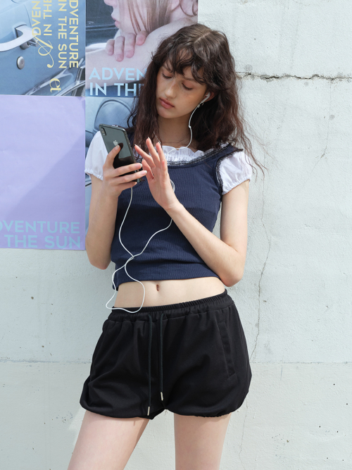 프릴 리본 스트랩 라운드넥 크롭 반팔 블라우스 셔츠_3COLOR