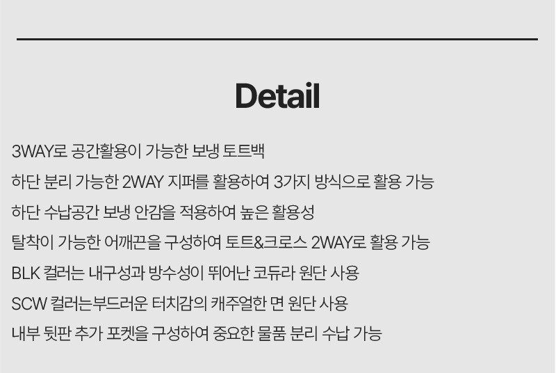 | 소재 | [BLK0]겉감:폴리에스터(100),[BLK0]안감:폴리에스터(100),[SCW0]겉감:면(100),[SCW0]안감:폴리에스터(100) (입고 시기에 따라 정보가 상이할 수 있어, 수령하신 상품의 라벨을 참고하시기 바랍니다.) |