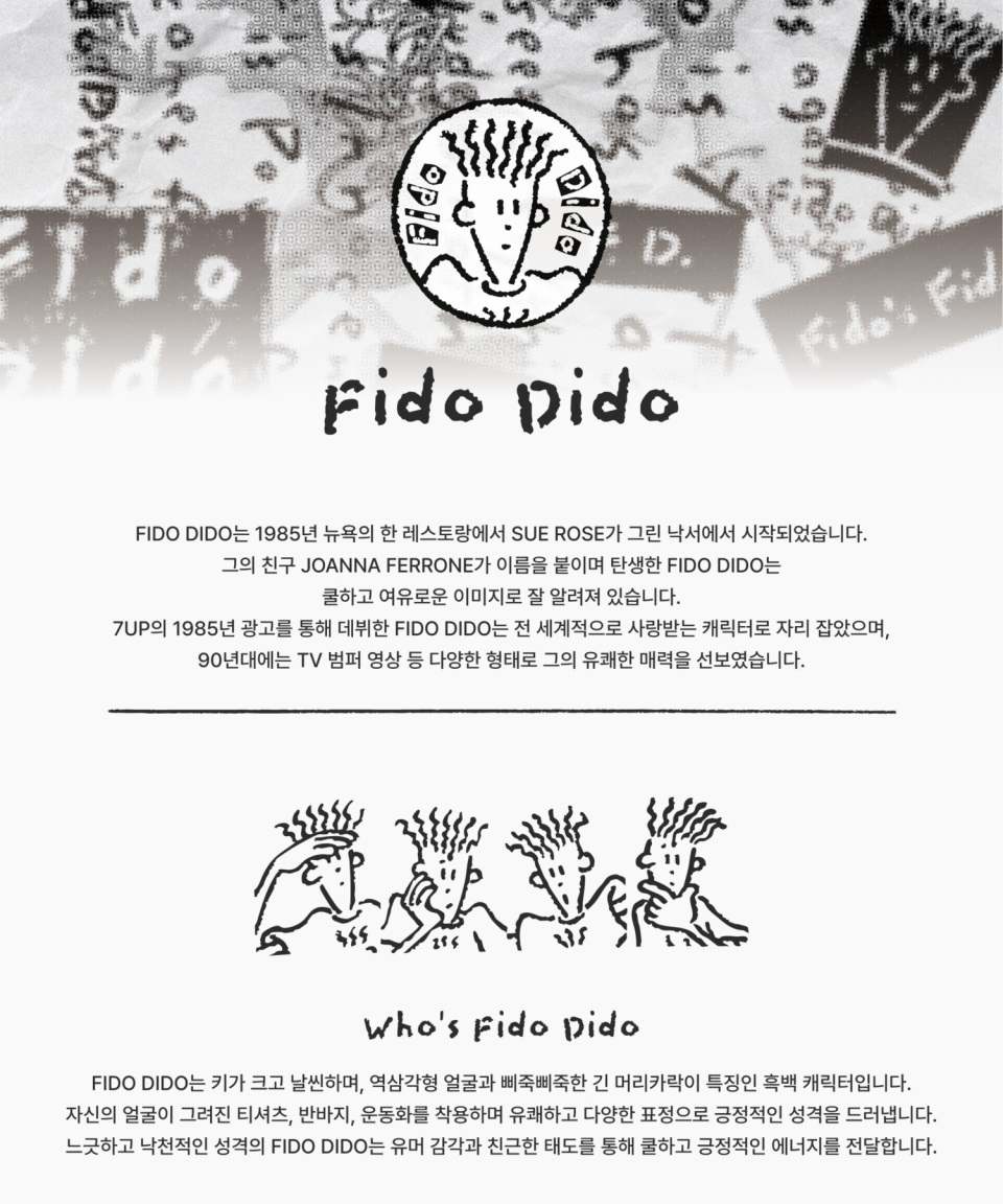 피도디도(FIDO DIDO)는 1985년 뉴욕의 레스토랑에서 SUE ROSE가 칵테일 냅킨에 그린 낙서를 본 친구 JOANNA FERRONE가 이름을 붙여 탄생한 브랜드입니다. 쿨하고 여유로운 이미지로 1988년 펩시의 7UP 커머셜에서 데뷔하여 전 세계적으로 알려지게 되었습니다. 90년대에는 TV 프로그램 사이의 범퍼 영상으로 다양한 모습을 보여주었고, 유쾌하고 여유로운 캐릭터는 'chill'한 마인드 셋을 대표하는 상징으로 자리 잡았습니다.