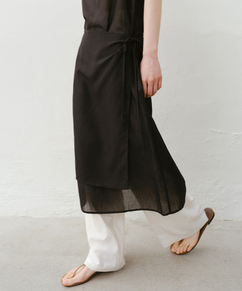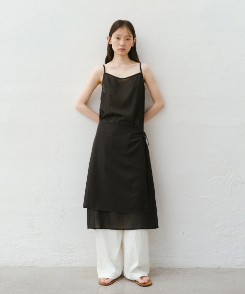 - 원피스에 랩 형태의 스커트가 연결된 독특한 디자인으로, 사이드 스트랩을 이용해 자유로운 실루엣 연출이 가능합니다.
