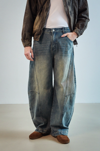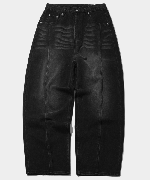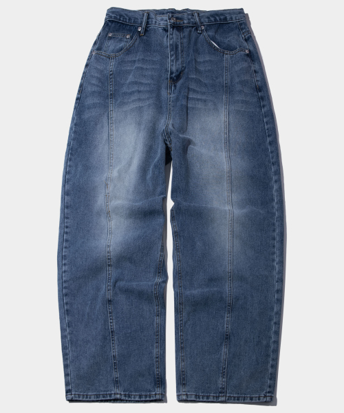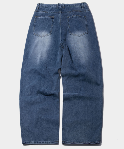 프론트 절개 캣 브러쉬 워싱 스트레이트 히든 벨티드 와이드 데님 팬츠 [중청]