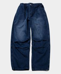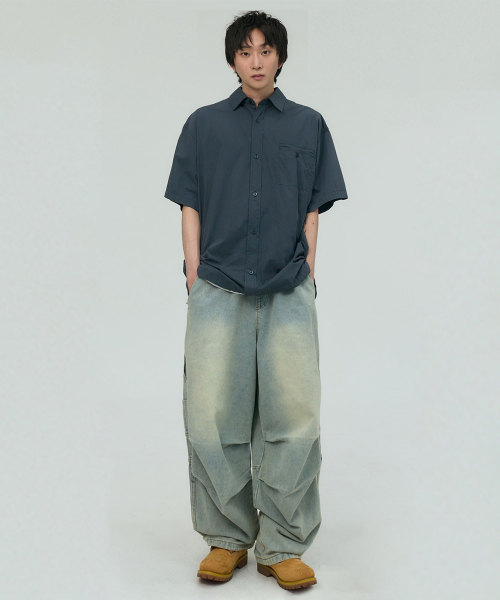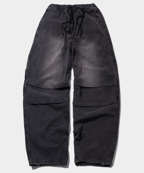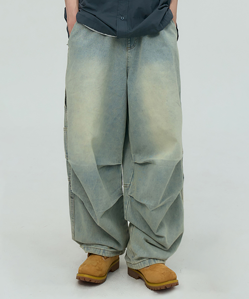 허리 밴딩 무릎 워싱 핀턱 파라슈트 와이드 데님 팬츠 [중청]