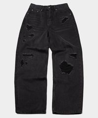 빈티지 워시드 데미지 패치 디테일 와이드 데님 팬츠 [흑청]