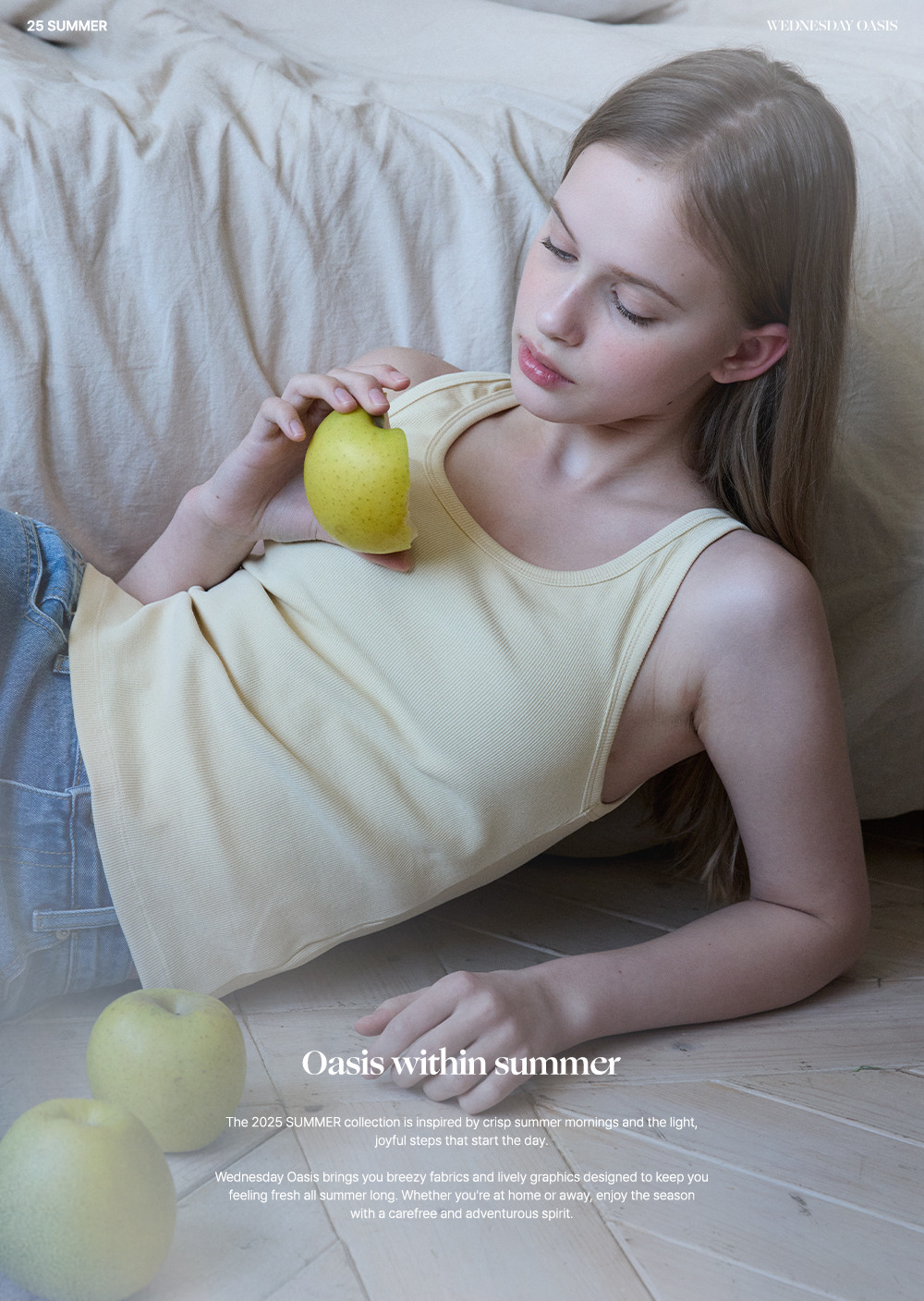 웬즈데이오아시스 포 우먼(WEDNESDAYOASISFORWOMEN)는 포근하고 안락한 라이프스타일과 함께 삶 속의 휴식 같은 옷을 핵심 가치로 추구하는 브랜드입니다.