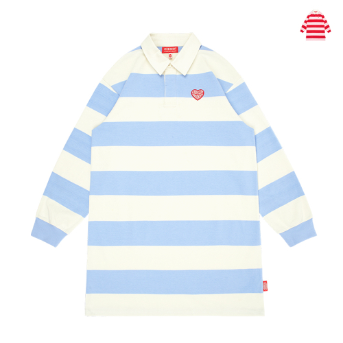 아이스비스킷 하트 와펜이 돋보이는 스트라이프 럭비 드레스입니다.